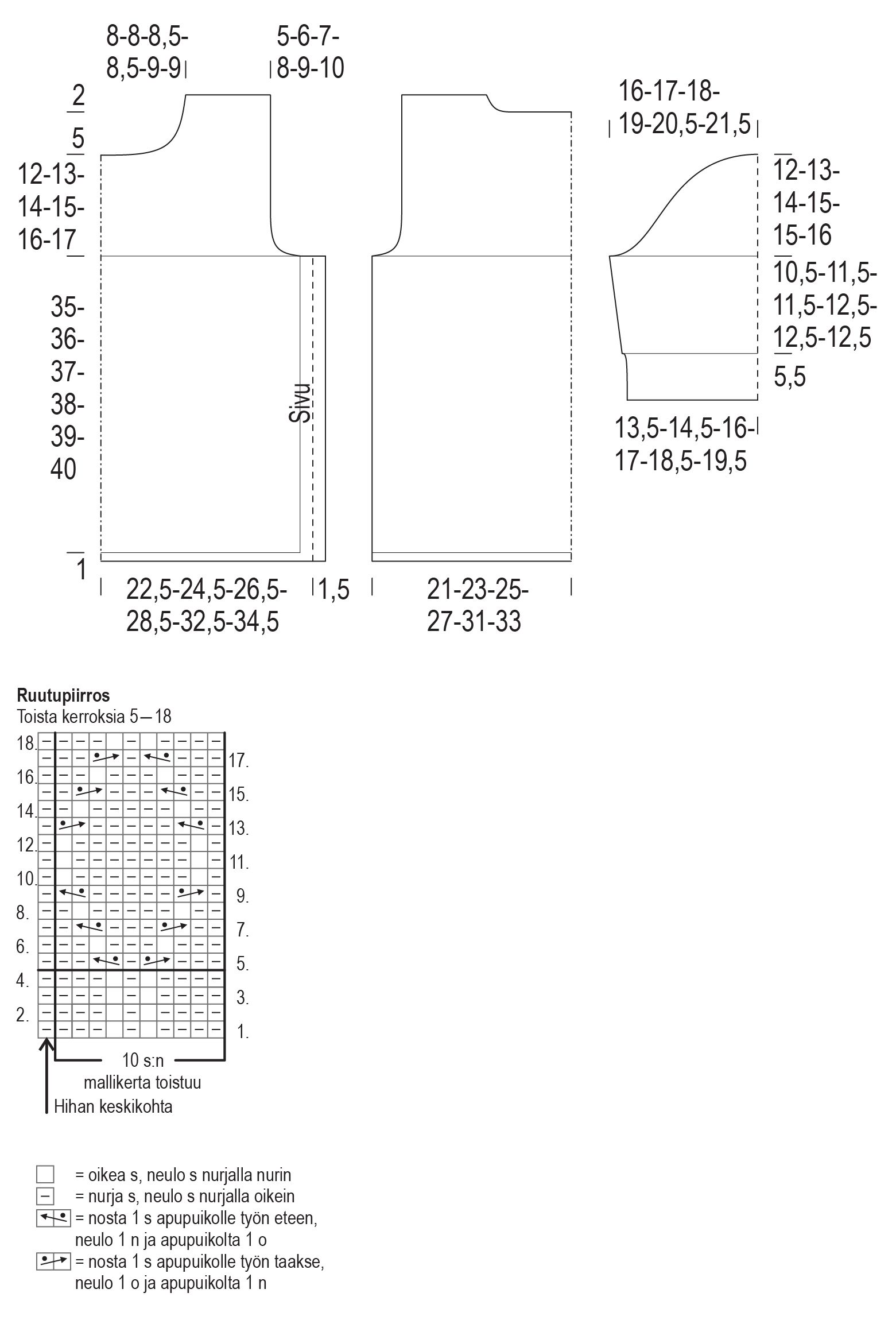 Aloita kohoneule ruutupiirroksen 1. kerrokselta: neulo 1 n, toista sitten 10 s:n mallikerta 10(11)12(13)15(16) kertaa, neulo ruutupiirroksen vasemmasta reunasta 1 s ja neulo 1 n.