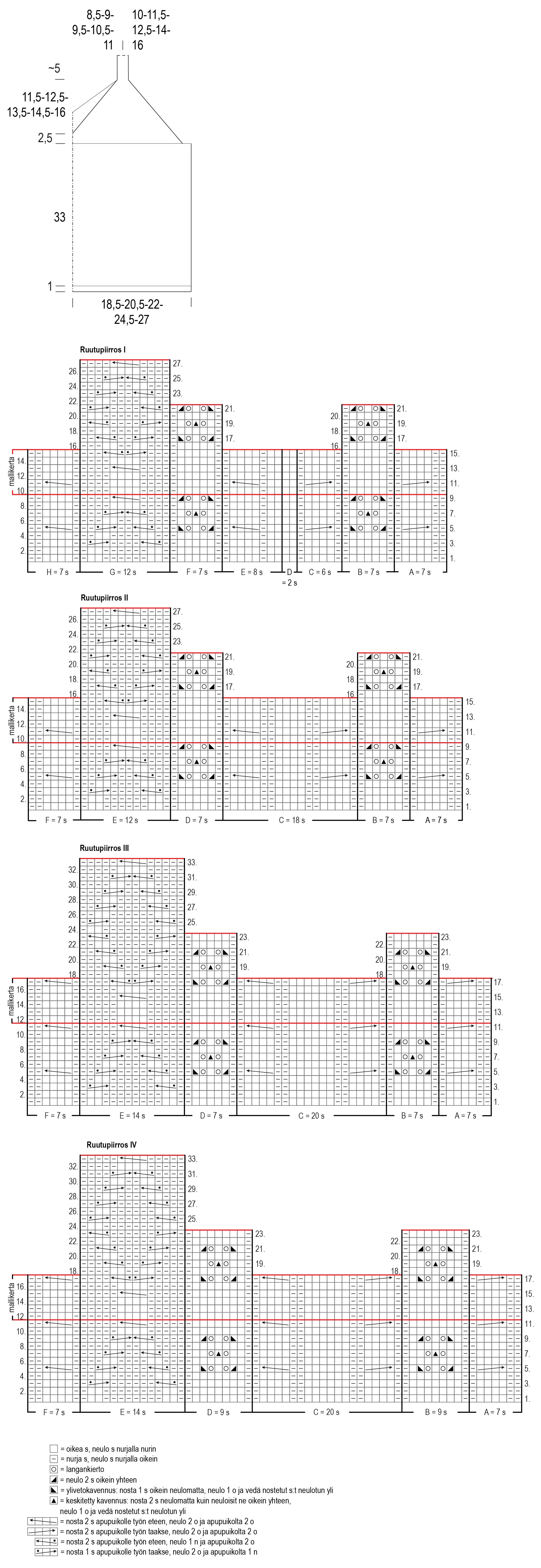 Koko S: neulo 5 s:lla sileää neuletta, neulo I ruutupiirroksen välit A–G, B–F ja H ja neulo 5 s:lla sileää.