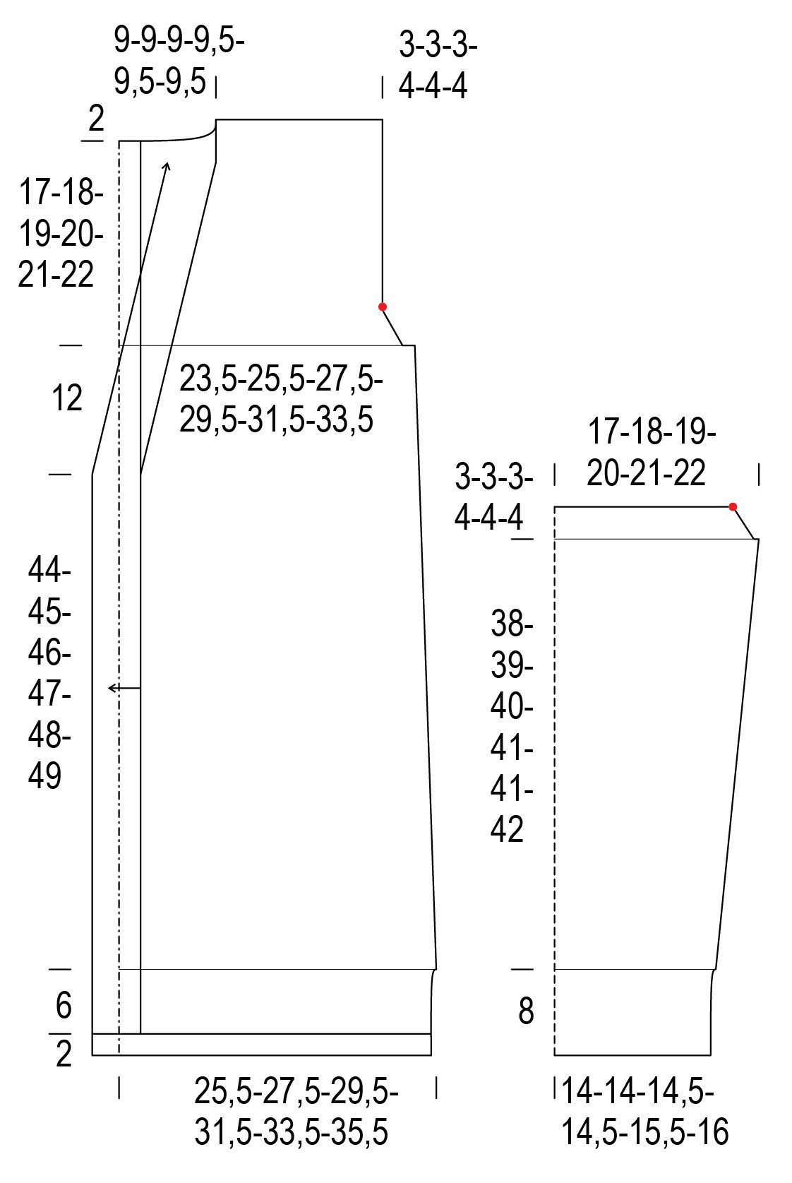Kun kappaleen korkeus on 21(22)22(23)23(24) cm, kavenna vasemmasta reunasta 1 s. Toista kavennus 10 cm:n välein vielä 3 kertaa = 42(46)48(51)58(61) s.
