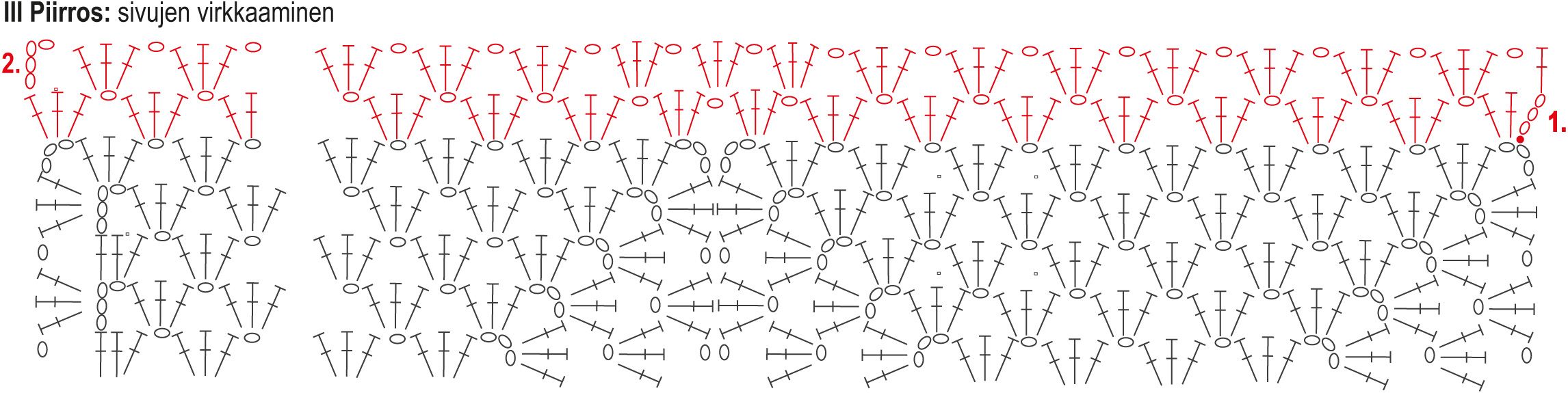 Virkkaa vasen sivu. Kiinnitä 2. väri ps:lla vasemman etukappaleen alakulmaan ja jatka virkkaamista III piirroksen 1. kerrokselta, merkitty piirrokseen punaisella.
