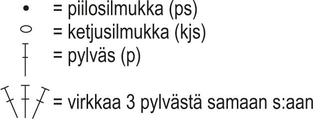 6. krs: Tee 3 kjs (= 1. p) ja ensimmäisen kjs:n ympäri 2 p + 1 kjs, tee kahteen seuraavaan reikään 3 p + 1 kjs, tee 3 s:n ketjuun kulmaan 3 p + 3 kjs + 3 p + 1 kjs, tee kahteen seuraavaan reikään 3 p + 1 kjs ja tee viimeiseen kjs-ketjuun 3 p. Käännä työ.