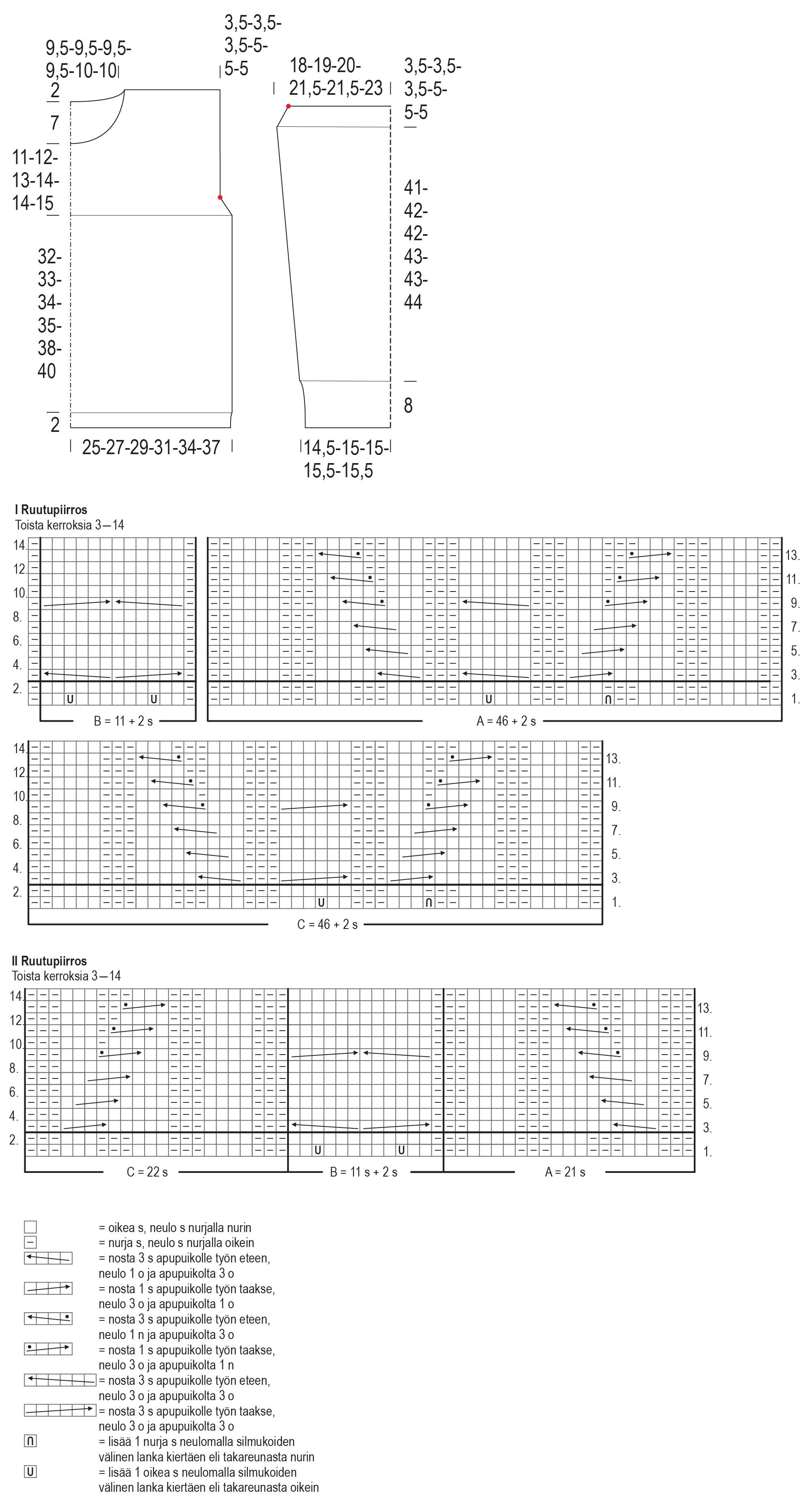 Huom. Kun kappaleen korkeus on 18(14)15(15)16(12) cm, lisää molemmissa reunoissa 1 s. Toista lisäykset 4,5(4,5)3,5(3)2,5(2,5) cm:n välein vielä 6(7)9(11)13(15) kertaa = 106(110)114(120)124(128) s.