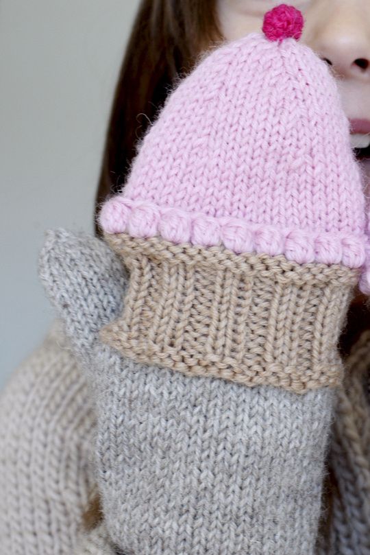 Novita 7 Veljestä -langasta neulottujen muffini-lapasten kiva yksityiskohta on virkattu koristekirsikka. Kaksi kokoa, lapselle ja naiselle.