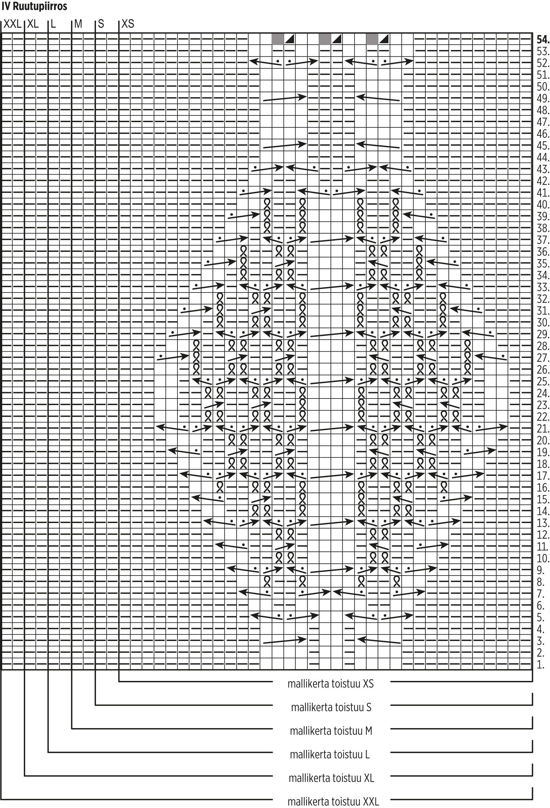 Neulo ensin III ruutupiirroksen kerrokset 2-38,sitten IV ruutupiirroksen kerrokset 1-47ja toista lopuksi IV ruutupiirroksen kerroksia 48-51 kunnes työn koko pituus on 53(55)57(59)61(63) cm. Neulo vielä ruutupiirroksen kerrokset 52-53. Neulo IV ruutupiirroksen 54. kerros ja kavenna samalla palmikoiden kohdilla 3 s ruutupiirroksen osoittamissa kohdissa ja lisäksi2(0)0(2)0(0)s tasavälein sileän nurjan kohdalla taka- ja etukappaleen palmikoiden väleissä ja 2(2)1(2)2(1) s tasavälein sileän nurjan kohdalla sivuissa=180(204)222(228)252(270)s.Vaihda työhön pienemmät puikot.