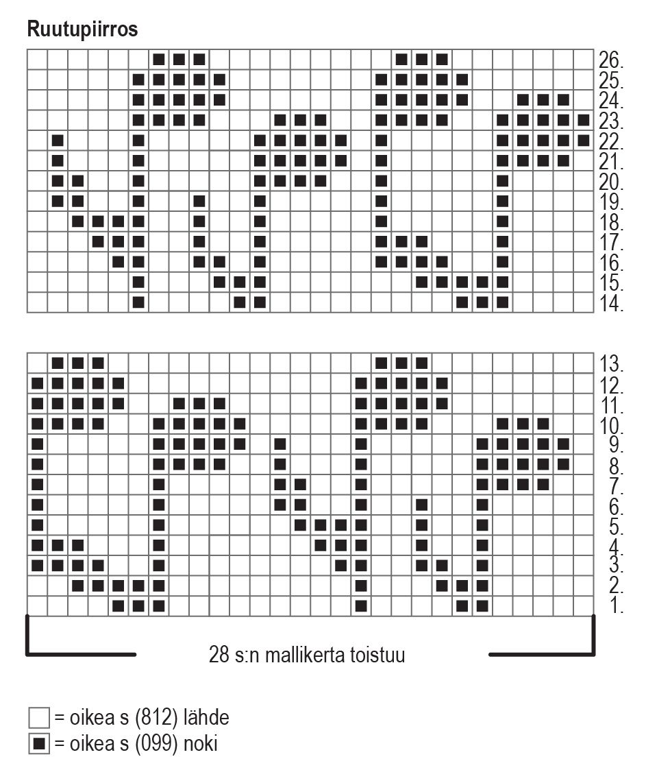 Neulo ruutupiirroksen kerrokset 1-13, neulo väliin 3 cm sileää neuletta lähteen värisellä langalla ja neulo ruutupiirroksen kerrokset 14-26.