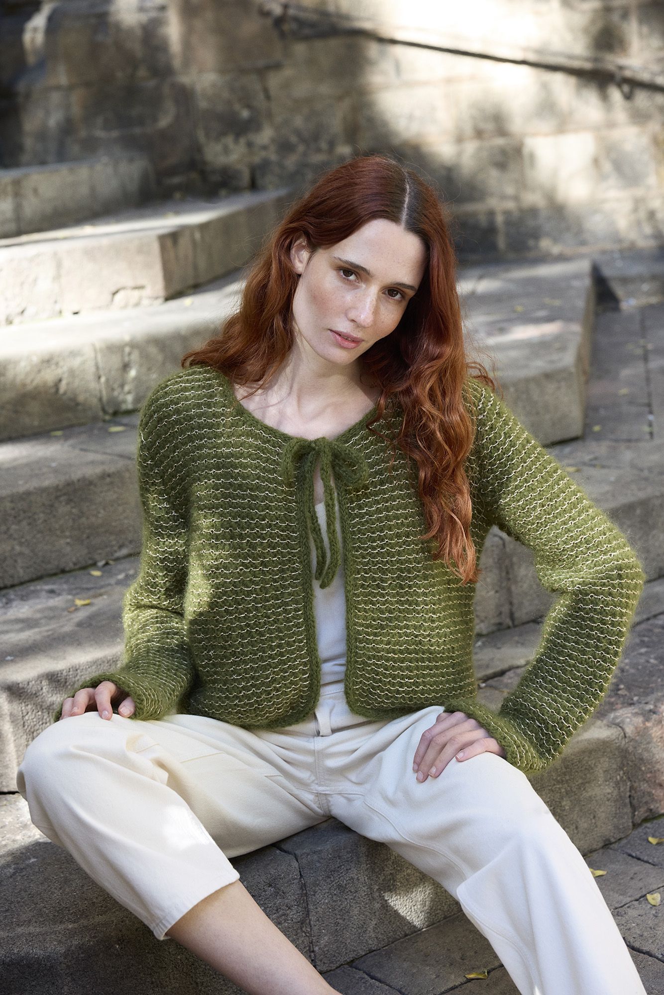 Gràcia-neuletakin mielenkiintoinen pinta syntyy neulomalla yhdessä Disco-ja Hehku-lankoja. Pörröisen mohairlangan ja kimaltavan kultalangan kaunis yhdistelmä on näyttävä mutta helppo neuloa. Kerrokset neulotaan yhdellä värillä kerrallaan ainaoikeinneuleena, ja kuvio syntyy neulotuista ja neulomatta nostetuista silmukoista. Kaunis jakkumainen takki huolitellaan lopuksi i-cord-onteloreunuksella ja rusettimaisesti eteen solmittavilla ontelonauhoilla.