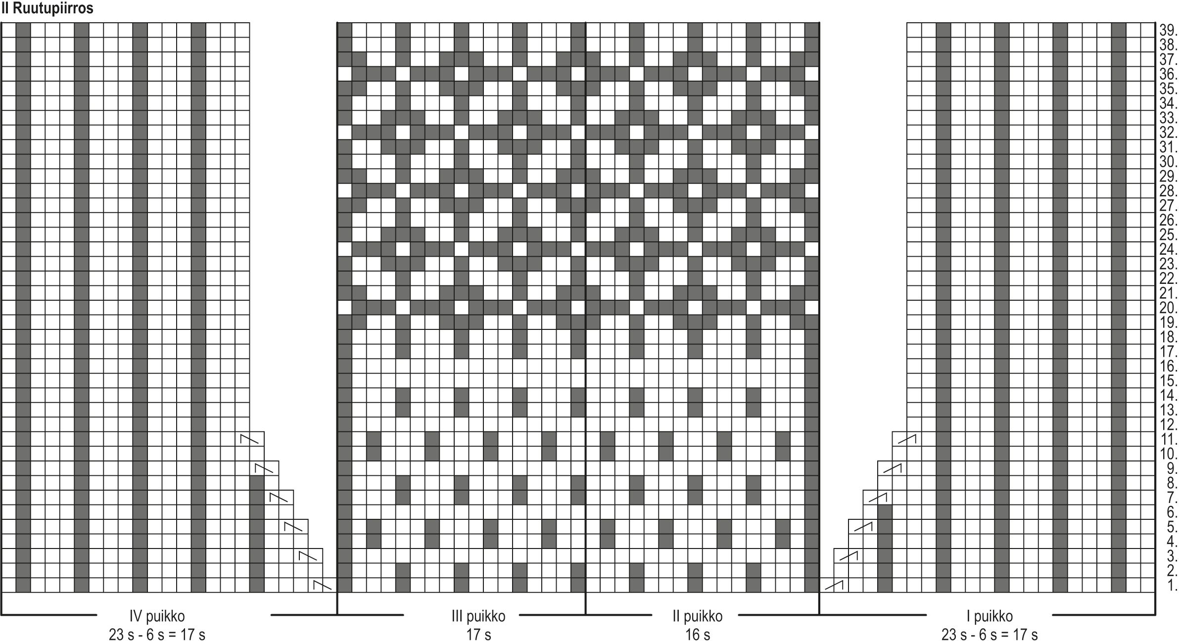 Jatka kirjoneuletta I ruutupiirroksen 28. krs:lta ja toista 4 s:n mallikerta 19 kertaa. Neulo ruutupiirroksen kerrokset 29-33, toista sitten kerroksia 28-33 ja kavenna samalla 2,5 cm:n välein 4x1 s kerroksen alussa ja lopussa: neulo kerroksen alussa 2 s oikein yhteen ja tee kerroksen lopussa ylivetokavennus (nosta 1 s oikein neulomatta, neulo 1 o ja vedä nostettu s neulotun yli). Työssä on kavennusten jälkeen 68 s, 17 s jokaisella puikolla. Huomaa, että kuvio rikkoutuu kerroksen vaihtumiskohdassa.