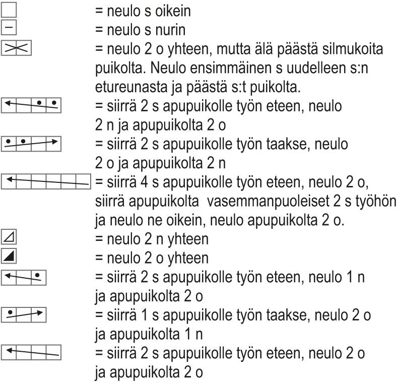 Mallineuleet Palmikkoneule suljettuna neuleena: neulo ohjeen ja ruutupiirroksen mukaan. Sileä neule suljettuna neuleena: neulo kaikki kerrokset oikein.