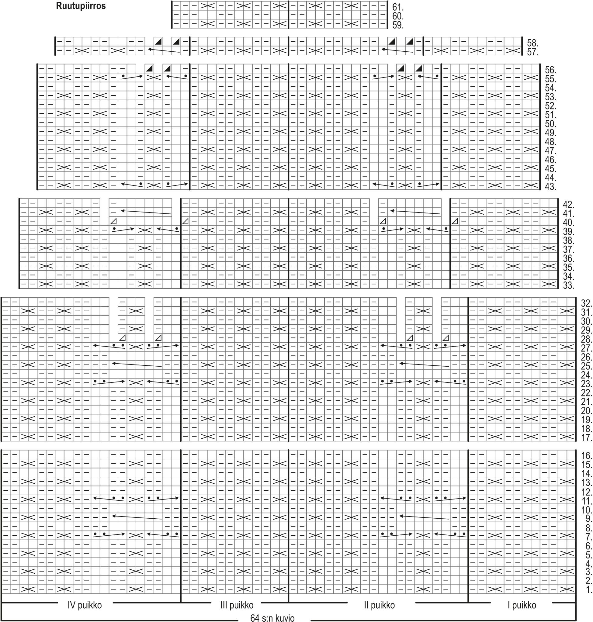 Luo 64 s ja jaa silmukat neljälle puikolle seuraavasti: I puikolle12 s, II puikolle20 s, III puikolle12 s ja IV puikolle20 s. Aloita palmikkoneulesuljettuna neuleena ruutupiirroksen 1. krs:lta ja neulo 64 s:n kuvio. Neulo ruutupiirroksen kerrokset 2–16 ja 1–16.