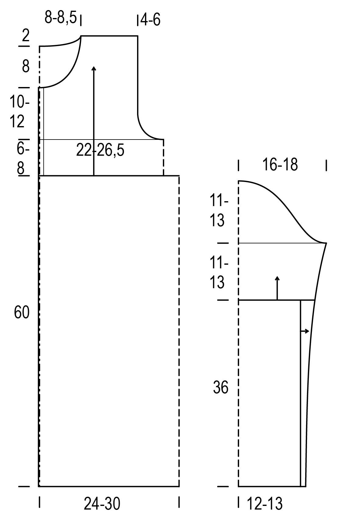 Kun kädentien korkeus on 20(22) cm, päätä loput olan 18(22) s.