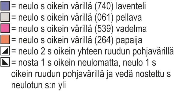 Mallineuleet Joustinneule suljettuna neuleena: neulo *2 o, 2 n*, toista *–*. Sileä neule suljettuna neuleena: neulo s:t jokaisella kerroksella oikein. Kirjoneule suljettuna neuleena: neulo sileää neuletta ruutupiirroksen ja ohjeen mukaan.