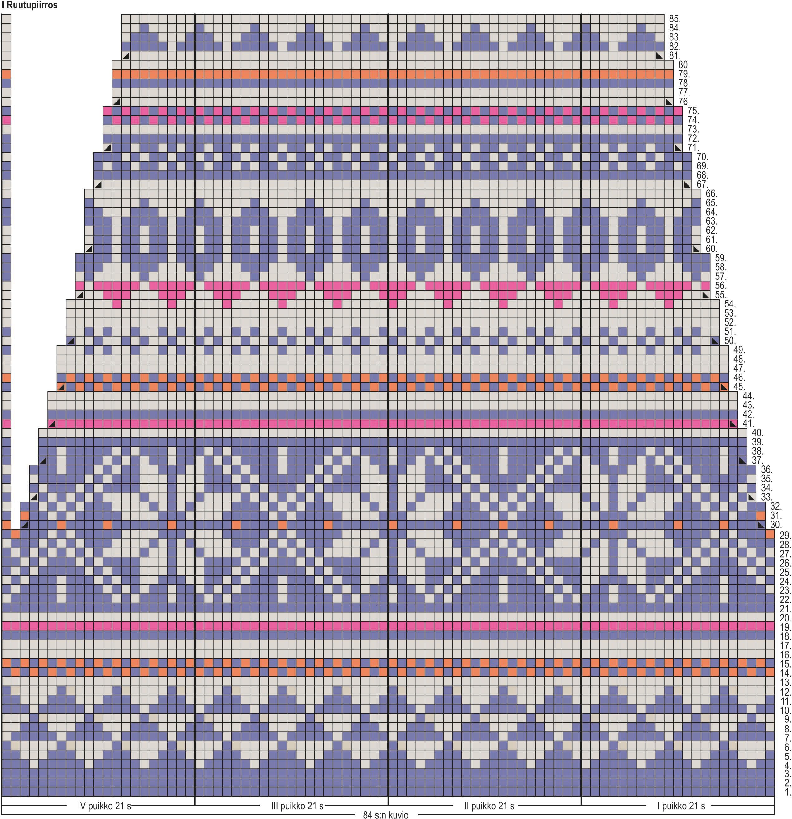 Jatka kirjoneuletta suljettuna neuleena III ruutupiirroksen 1. krs:lta ja toista 2 s:n mallikertaa kerros loppuun. Neulo ruutupiirroksen krs:t 2–40 ja toista sitten krs:ia 1–40.