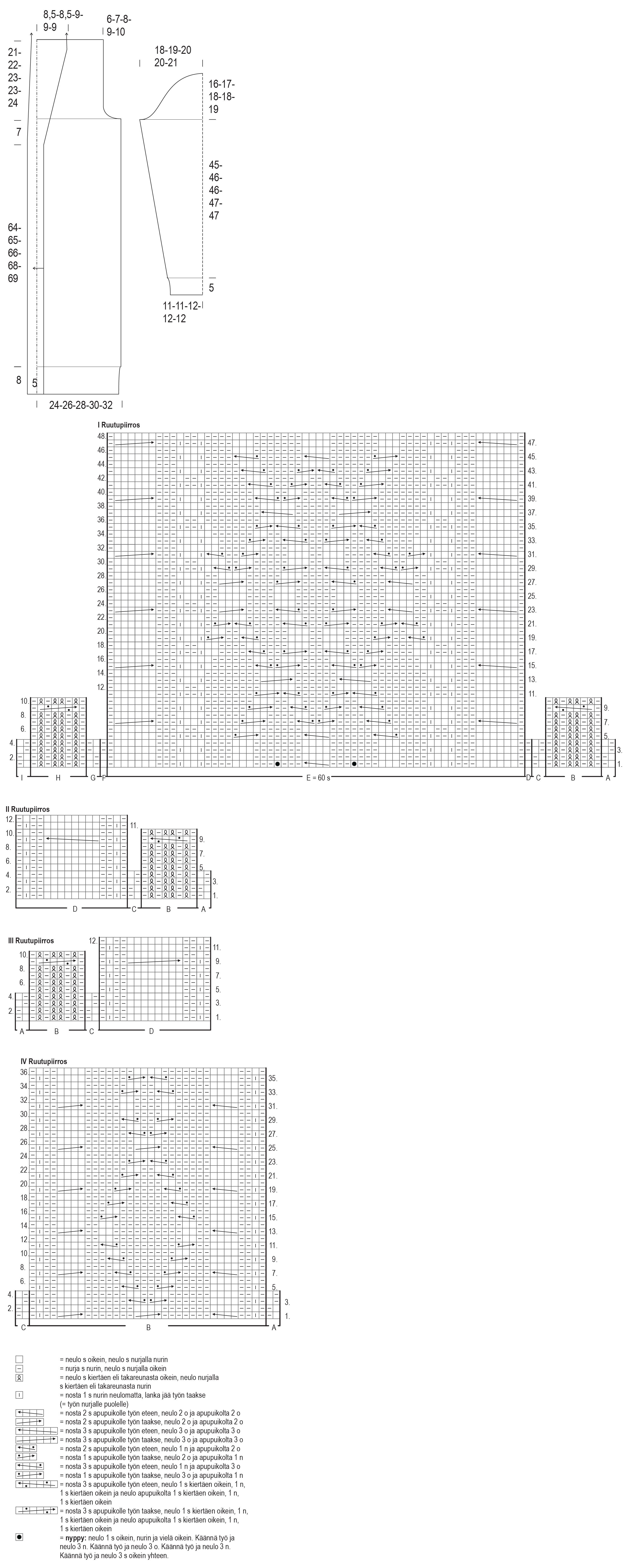 Huom. Kun kappaleen korkeus on 72(73)74(76)77 cm, päätä kädentietä varten vasemmassa reunassa joka 2. krs 1x8(8)10(10)10 s ja 0(1)1(1)2x2 s. Kavenna vasemmassa reunassa 1 s: neulo oikean puolen kerroksella 1 o, tee ylivetokavennus ja neulo kerros loppuun. Neulo jatkossa nurjan puolen kerrosta, kunnes jäljellä on 2 s ja neulo 1 n, 1 o. Toista kavennukset joka 2. krs vielä 3(3)3(5)5 kertaa.