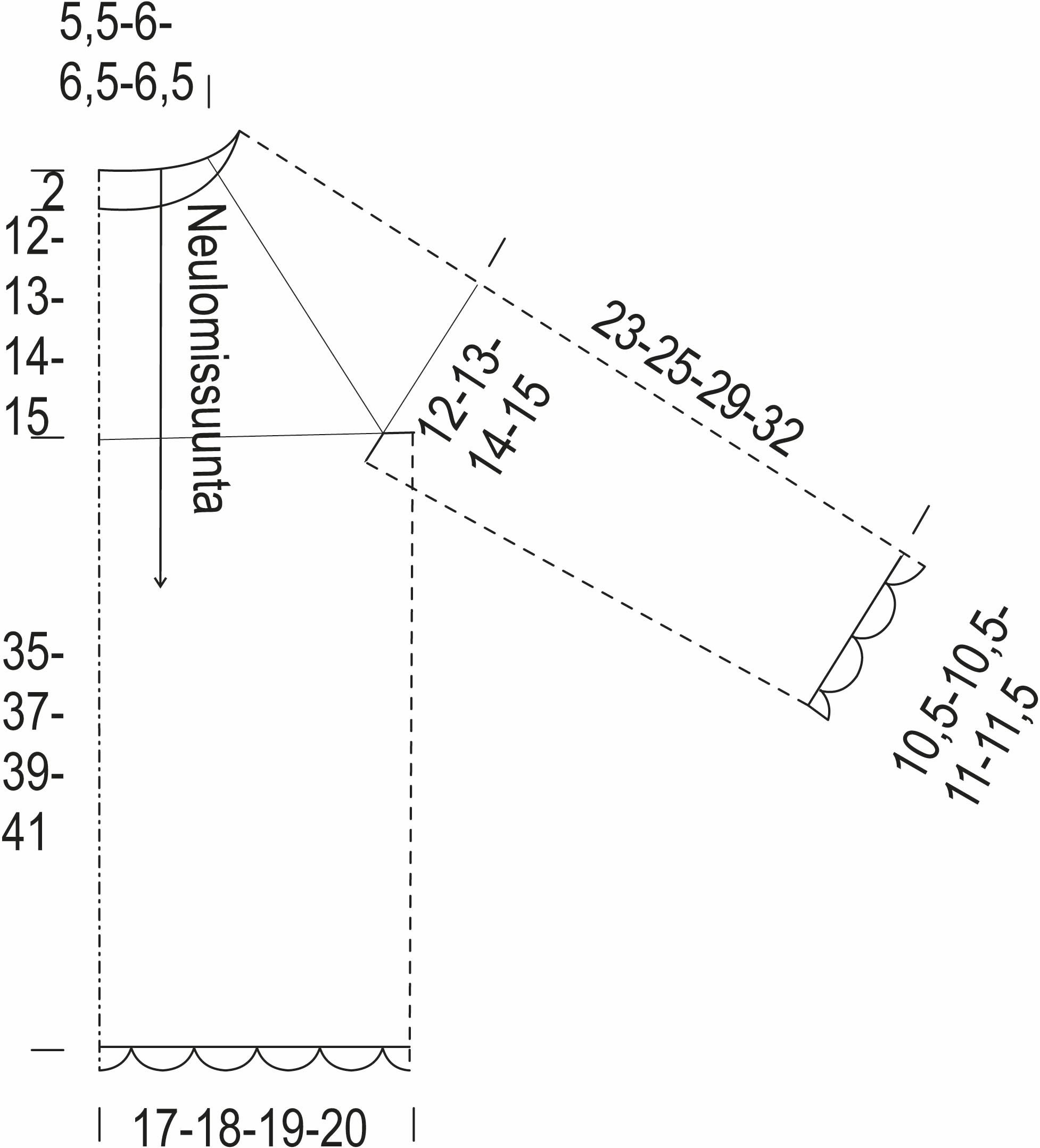 Pyöröpuikot (40 ja 60 cm) Novita 3,5 mm tai käsialan mukaan, hihoja varten sukkapuikot Novita 3,5 mm, jos et neulo Magic Loop -tekniikalla ja reunuksia varten virkkuukoukku Novita 3,5 mm Muut tarvikkeet 5 silmukkamerkkiä