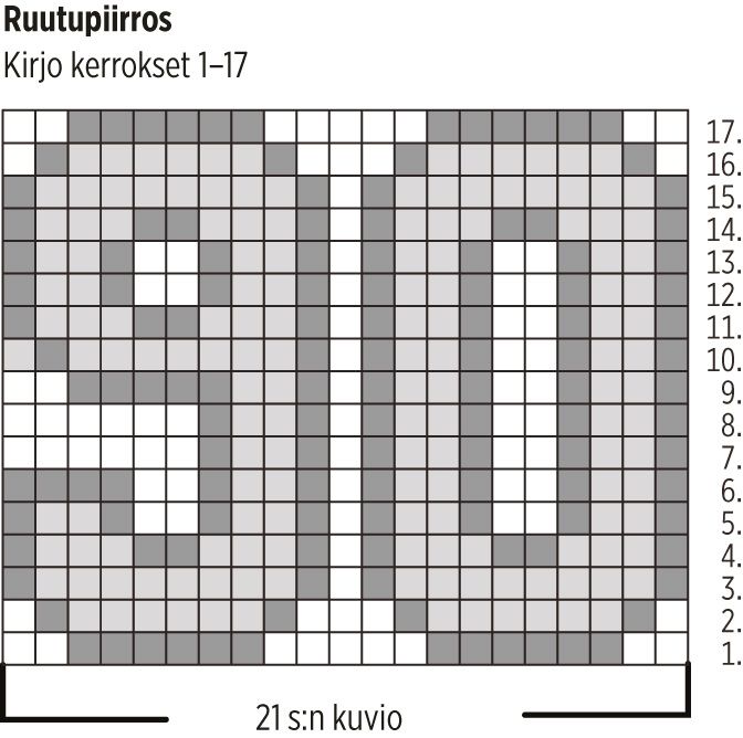 Jatka sileää suljettua neuletta ja neulo 2 krs:ta valkoisella, 21 krs:ta koskella, 2 krs:ta valkoisella. Jatka neulomista puolukan värisellä langalla.Huom! Kirjaimet Å(Ä)Ö ovat korkeampia kuin muut kirjaimet. Neulo näitä kirjaimia varten leveään kosken väriseen raitaan 6(4)4 ylimääräistä kerrosta.