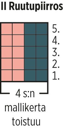 Luopääntietävartenjäänvärisellä langallalyhyille3,5 mmpyöröpuikoille100(100)100(100)120(120)s ja neulo joustinneulettasuljettuna neuleena2,5cm. Jatka joustinneuletta kirjoneuleenaI ruutupiirroksen mukaan ja toista 20 s:n mallikertaa 5(5)5(5)6(6)kertaa=100(100)100(100)120(120)s. Neulo ruutupiirroksen kerrokset 1-12.Jatka marjapuuron värisellä langalla joustinneuletta 14 cm. Käännätyön nurja puoli ulospäin ja vaihda neulomissuuntaa.Vaihda työhön paksummat puikot.Neulo1krssileääneulettasuljettuna neuleena jalisääsamalla28(40)48(40)48(48)s tasaisinvälein =128(140)148(140)168(168)s.Neulo vielä0(2)2(4)4(6)krs sileää neulettajalisääsamallaviimeisellä kerroksella0(0)0(20)0(20) s tasaisinvälein=128(140)148(160)168(188) s.