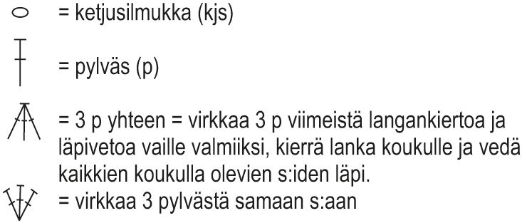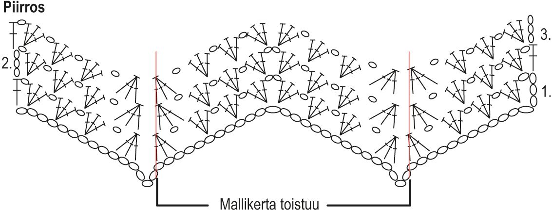 1. krs: tee 5. kjs:aan koukusta laskien 3 p, 1 kjs, (jätä 2 aloitusketjun s:aa väliin ja virkkaa seuraavaan kjs:aan 3 p, 1 kjs) x 2, jätä 2 s väliin, virkkaa 3 p yhteen, *jätä 3 s väliin, virkkaa 3 p yhteen, 1 kjs, (jätä 2 s väliin ja virkkaa seuraavaan kjs:aan 3 p, 1 kjs) x 2, jätä 2 s väliin, virkkaa seuraavaan s:aan 3 p + 2 kjs + 3 p + 1 kjs, (jätä 2 s väliin ja virkkaa seuraavaan kjs:aan 3 p, 1 kjs) x 2, jätä 2 s väliin, virkkaa 3 p yhteen*. Toista *-* vielä 7 kertaa, jätä 3 s väliin, virkkaa 3 p yhteen, 1 kjs, (jätä 2 s väliin ja virkkaa seuraavaan kjs:aan 3 p, 1 kjs) x 3 ja tee vielä 1 p samaan s:aan kuin edelliset 3 p. Käännä työ.