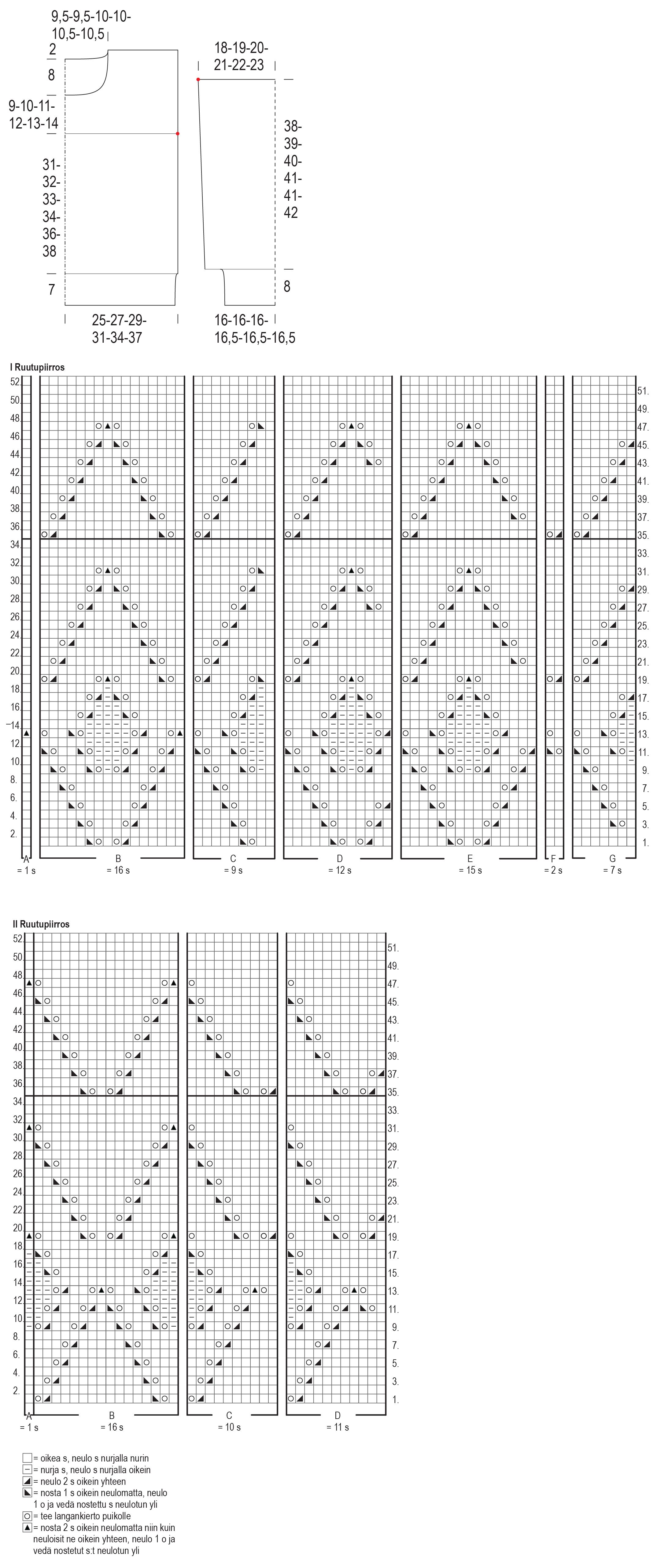 Vaihda paksumpiin puikkoihin ja aloita pitsineule I ruutupiirroksen 1. kerrokselta: neulo väli C(D)E(F)G(D) [= 9(12)15(2)7(12) s], toista sitten väli B 4(4)4(6)6(6) kertaa [= 64(64)64(96)96(96) s], neulo väli A (= 1 s) ja neulo peilikuvana väli C(D)E(F)G(D) [= 9(12)15(2)7(12) s]. Neulo I ruutupiirroksen kerrokset 2-34 ja toista sitten kerroksia 35-52 kappaleen loppuun.