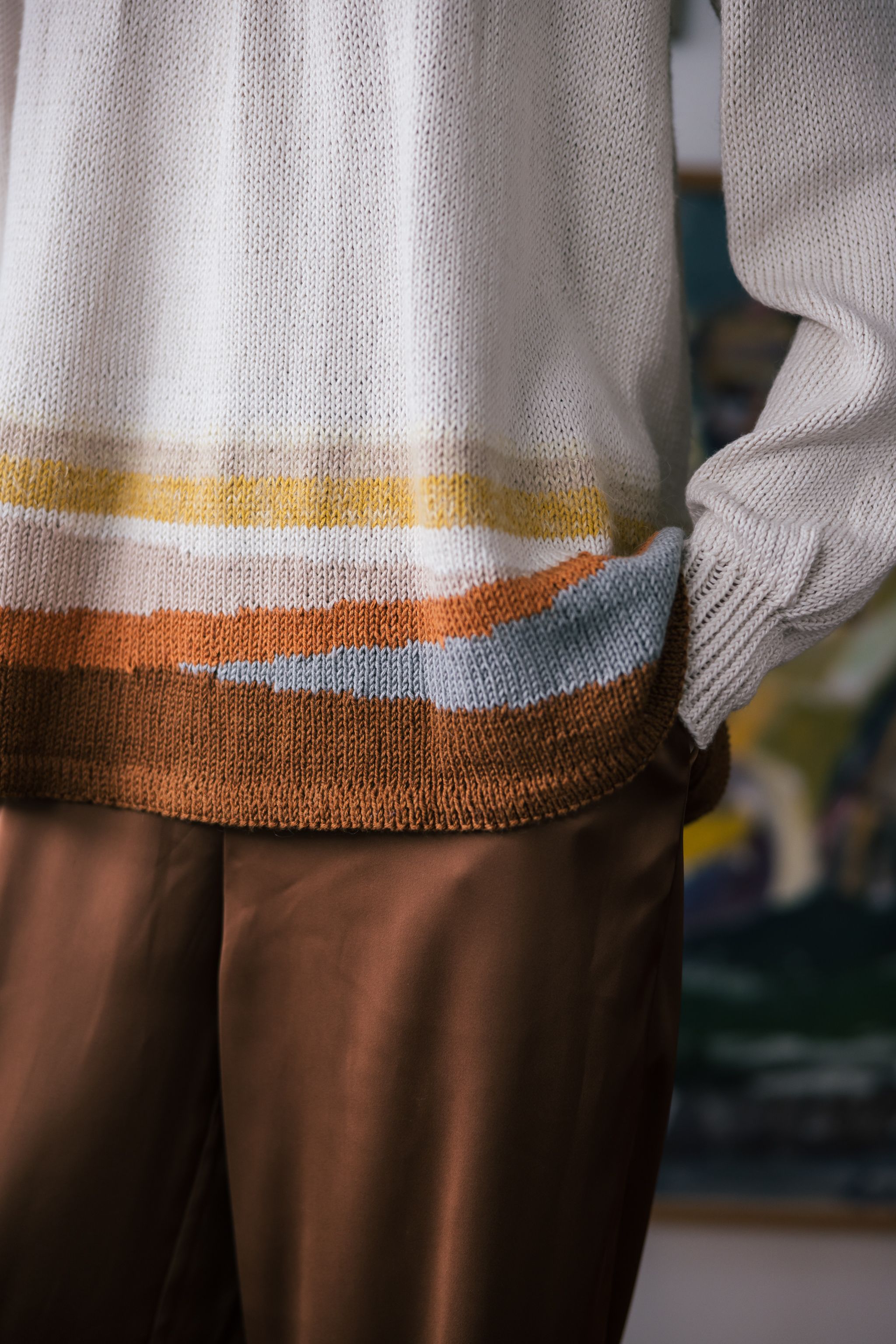 Luo ohuemmalle pyöröpuikolle (80 cm) värillä (660) fado 125(131)137(143)149 s. Neulo sileää neuletta tasona 6 krs, neulo nurjalla 1 krs oikein (= taite). Vaihda työhön paksummat pyöröpuikot (80 cm) ja neulo sileää neuletta 6 krs.