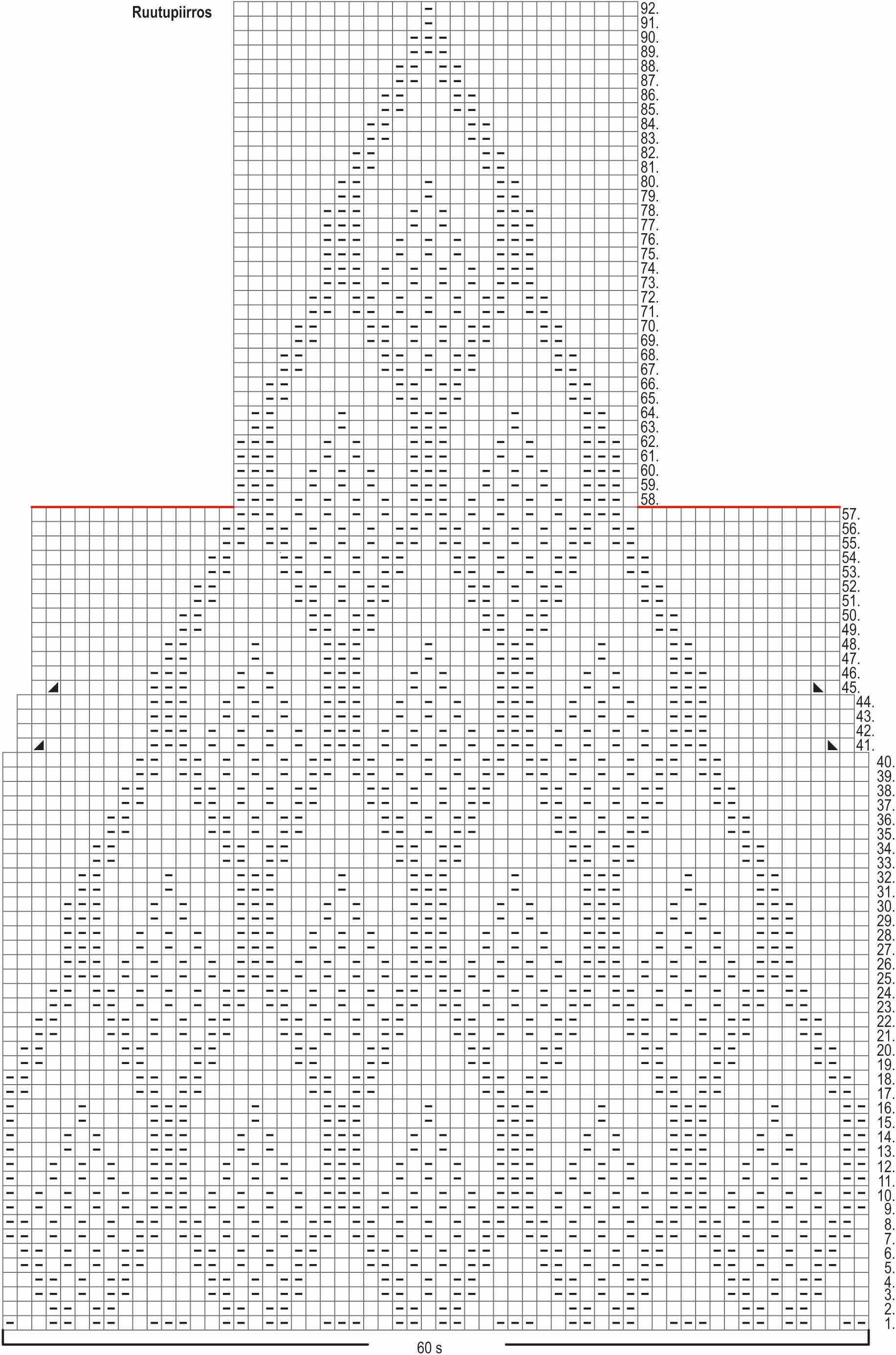 Aloita joustinneule ruutupiirroksen 1. krs:lta ja neulo 60 s:n kuvio. Toista kerrosta 1, kunnes työssä on 10 krs. Neulo ruutupiirroksen kerrokset 2–57. Tee kavennukset puikon I alussa ja puikon IV lopussa ruutupiirroksen kerroksilla 41 ja 45. Kavennusten jälkeen työssä on 56 s. Tasaa silmukat puikoille, 14 s kullekin.