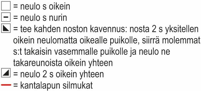 1. krs (NP): nosta 1 s neulomatta, lanka työn nurjalla puolella ja neulo muut s:t nurin. Käännä työ.