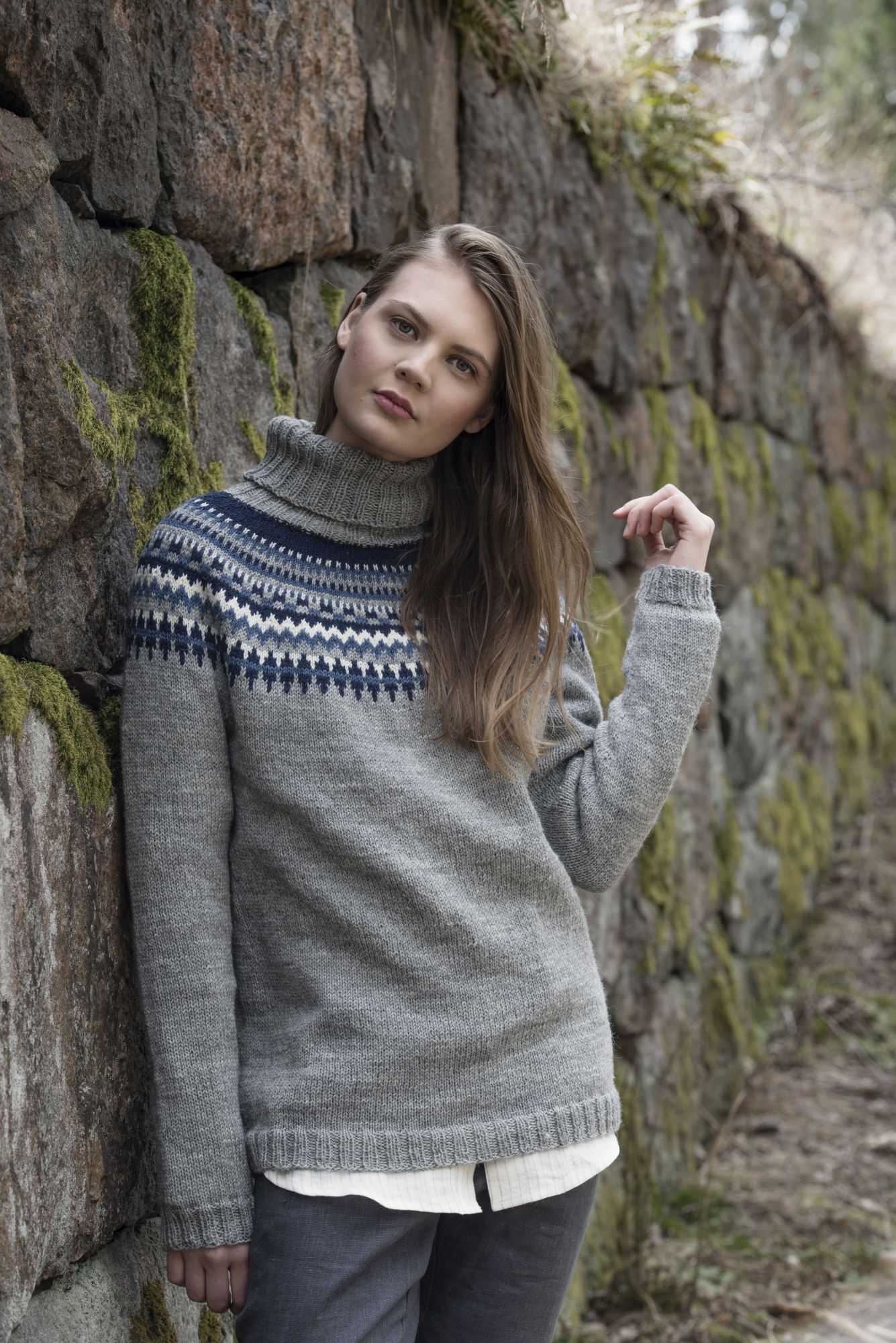 Naisen kaarrokeneule on neulottu Novita Nalle - langasta. Perinteisen ja kauniin kirjoneuleen taka- ja etukappale neulotaan kädenteille asti yhtenä kappaleena.