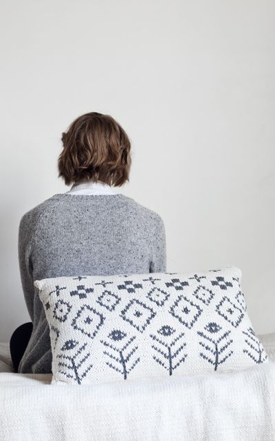 Novita Isoveli -langasta neulottu kirjoneuletyynynpäällinen antaa uutta ilmettä kodin kevään sisustukseen.