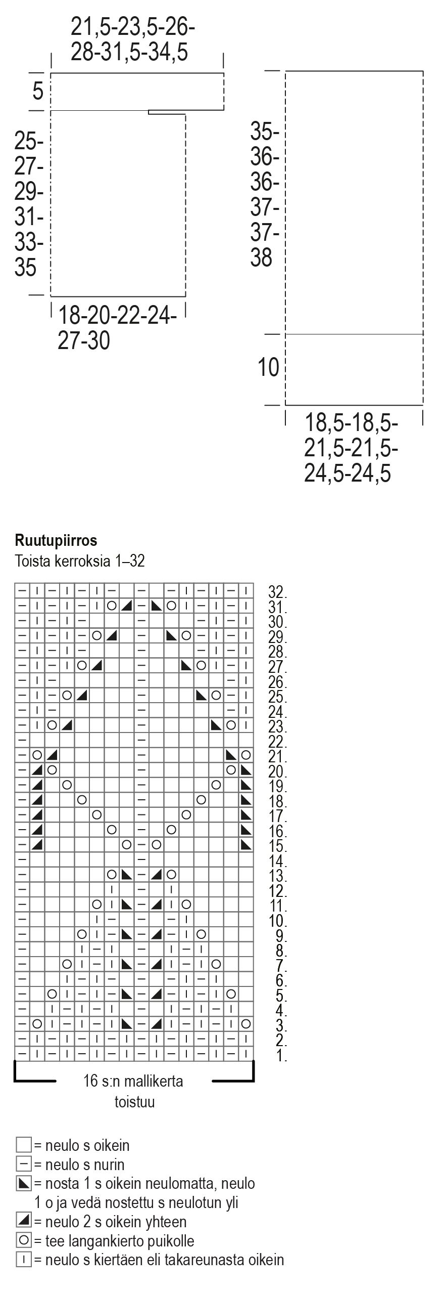 Aloita pitsineule suljettuna neuleena ruutupiirroksen 1. kerrokselta ja toista sitten 16 s:n mallikerta 6(6)7(7)8(8) kertaa. Aseta kerroksen vaihtumiskohtaan silmukkamerkki. Neulo ruutupiirroksen kerrokset 2–32 ja toista sitten kerroksia 1–32.