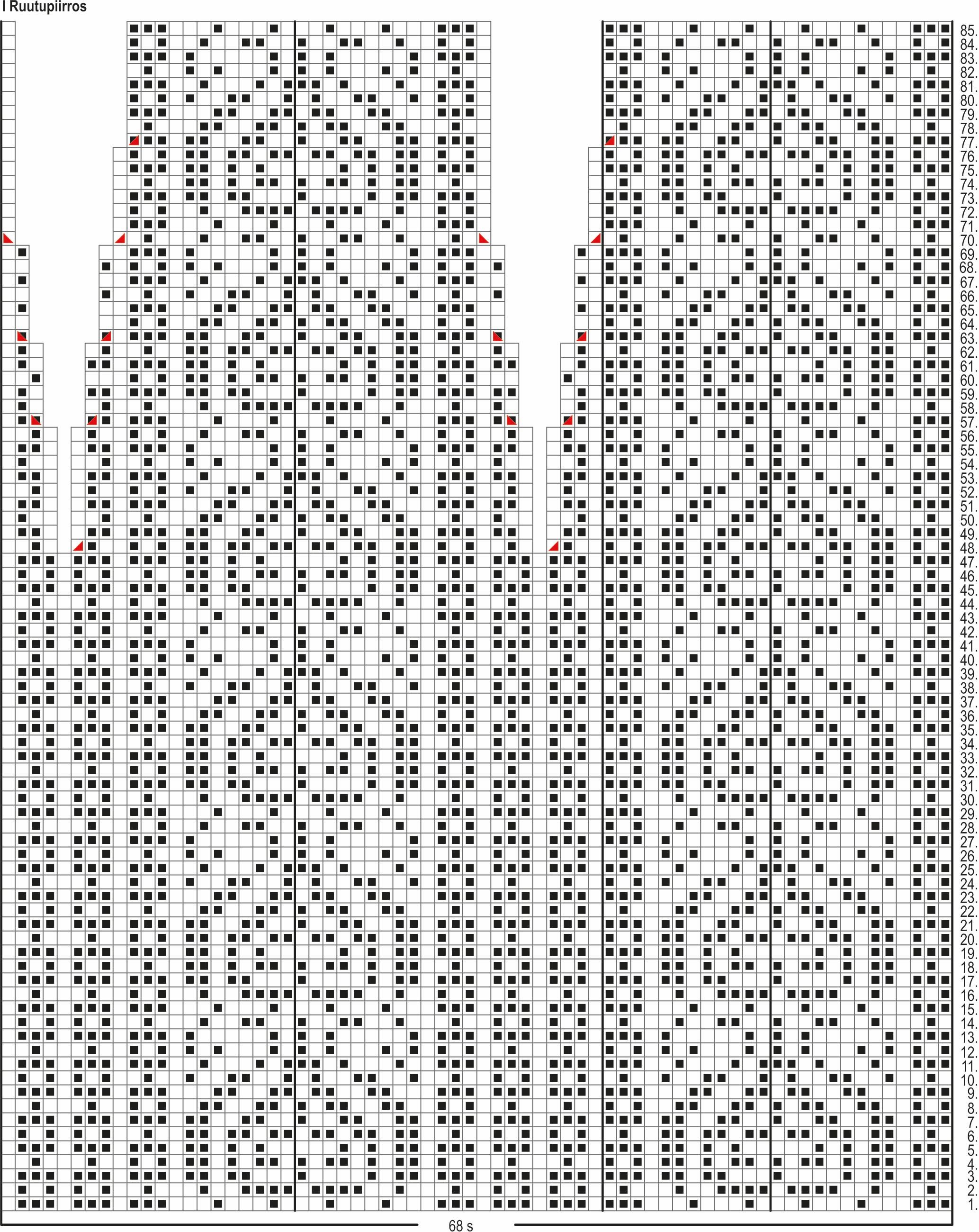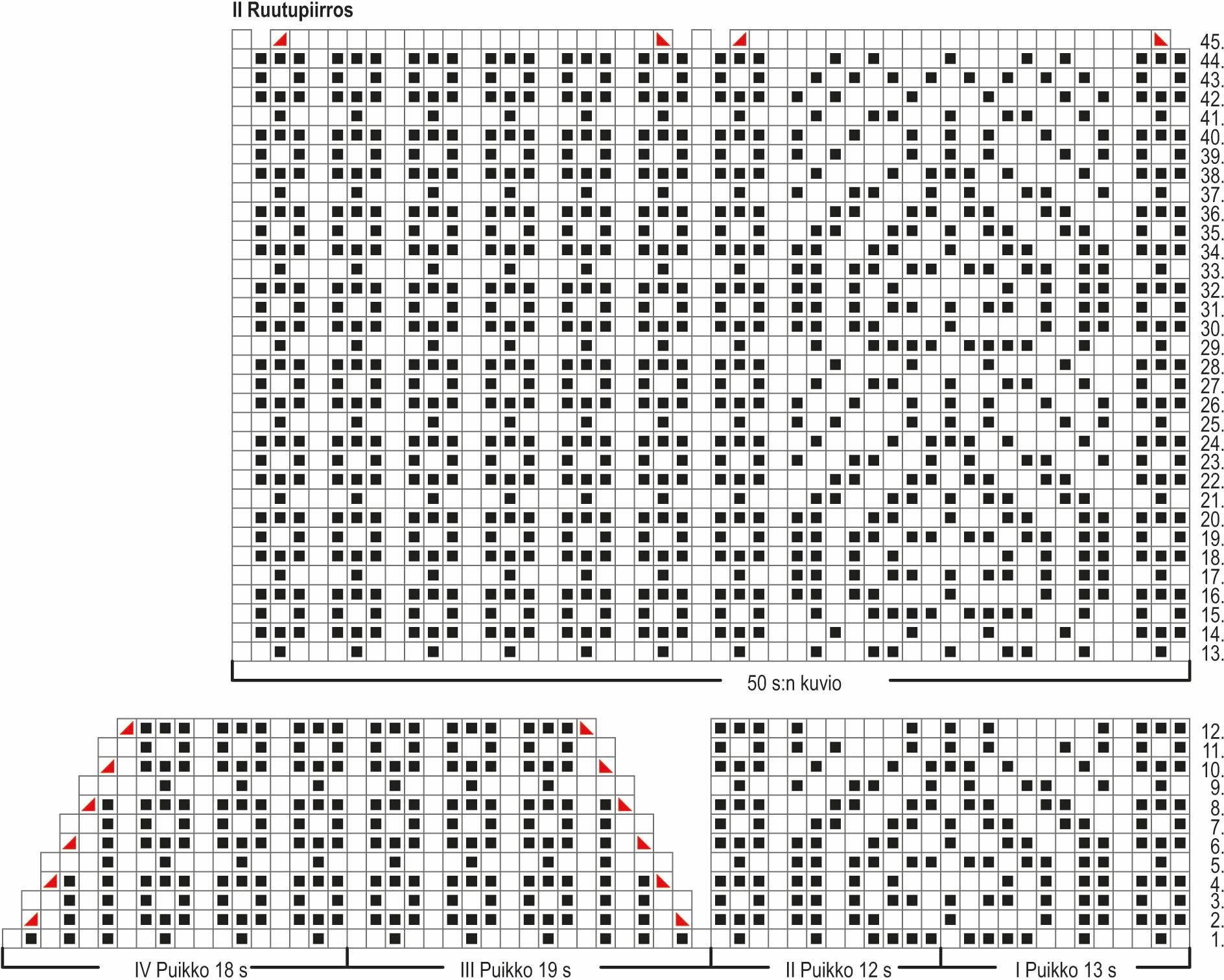 Jatka kirjoneuletta II ruutupiirroksen 13. krs:lta ja neulo 50 s:n kuvio. Neulo ruutupiirroksen kerrokset 14–45. Viimeisellä kerroksella kaventuu 4 s ja työssä on 46 s.