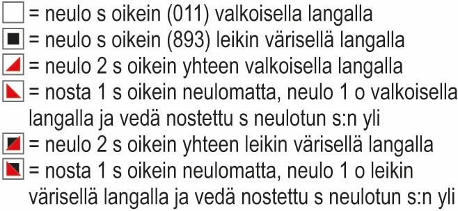 1. krs (NP): nosta 1 s neulomatta, lanka jää työn nurjalle puolelle ja neulo muut s:t nurin. Käännä työ.