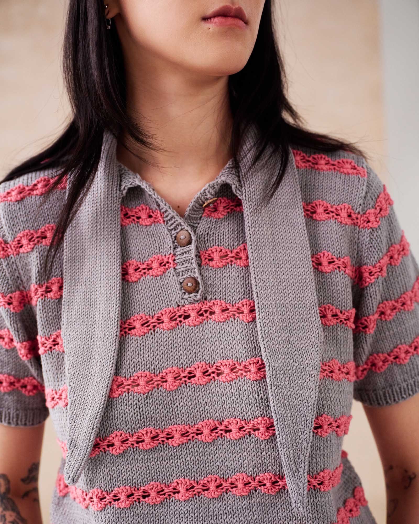 Kukkia-pusero neulotaan kesäisellä Novita Sointu-langalla kaikki kappaleet erikseen tasona. Mallin neulepinnan juju on kontrastivärillä tehtävät pitsiset kukkaraidat, joiden neulomiseen löydät apuja Novita.comin neulekouluista. Neuleen näyttävä yksityiskohta on viimeistelyvaiheessa neulottava kaulus, jonka voi solmia kauniiksi rusetiksi kaulalle tai sen lipareet rennosti auki.Malli on osa Rolf Ekrothin Lavatanssi-kesämallistoa 2025, joka esiteltiin Kööpenhaminan muotiviikoilla.