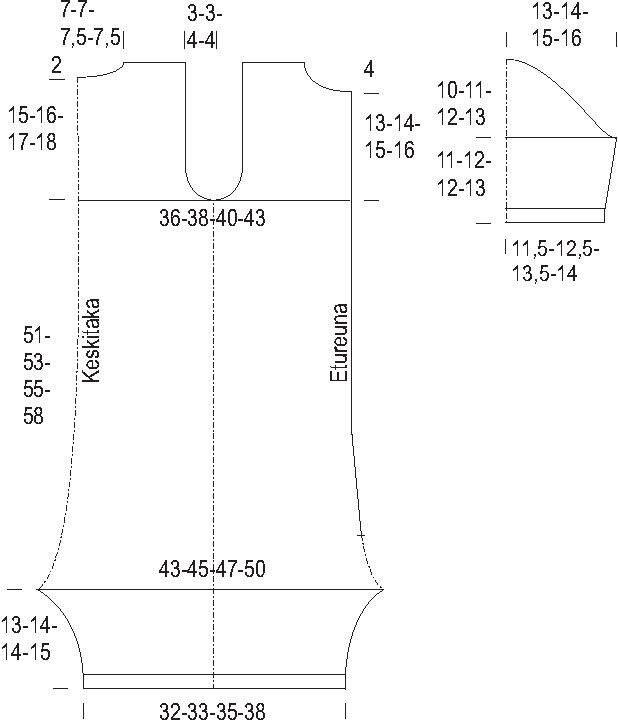 Ota etukappaleen puolella odottavat 37(39)40(44) s ja kavenna kädentiellä joka 2. krs 1x2 s ja 1(1)2(2)x1 s = 34(36)36(40) s.