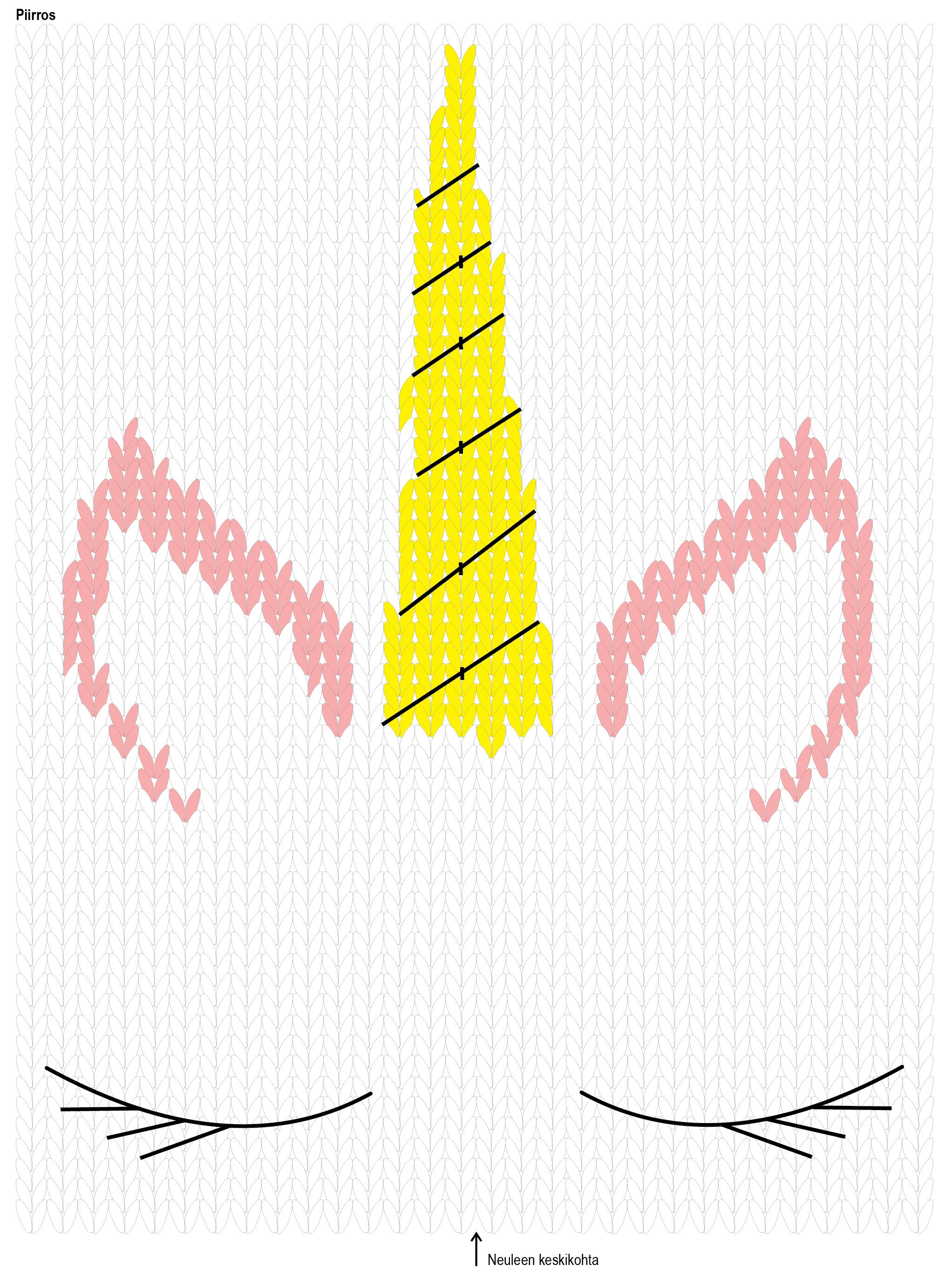 Kirjo kuvio piirroksen mukaan keskelle etukappaletta (piirroksen alareunaan on nuolella merkitty kappaleen keskikohta, laske siitä kuvion aloituskohta). Kirjo sarvi sahramilla ja korvat ruusulla silmukoita jäljentäen, siten, että sarven kärki tulee noin 3 cm pääntien joustimen alapuolelle. Kirjo silmät ja ripset grafiitin värisellä langalla varsipistoin. Tee sarveen poikittaiset pistot sahramin värisellä langalla ja sido pistot keskeltä pienellä poikkipistolla.