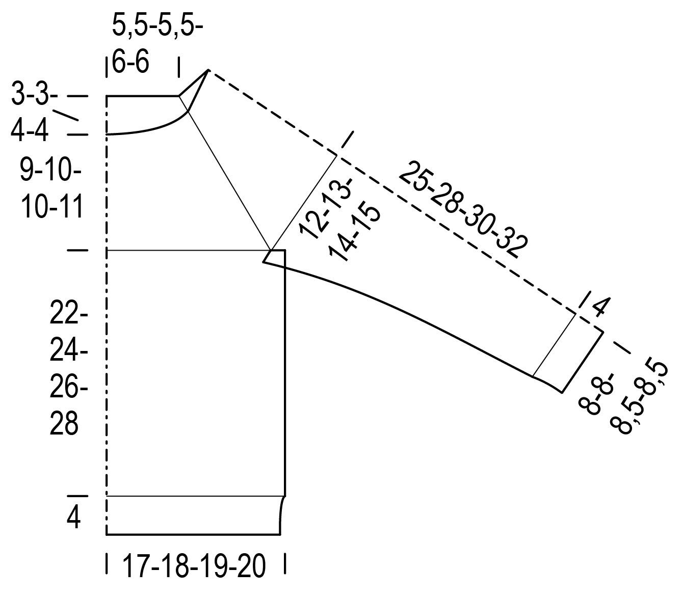 Toista kavennukset etu- ja takakappaleella joka 2. krs vielä 11(14)15(18) kertaa ja sitten joka kerros 10(8)8(6)x1 s ja samanaikaisesti hihoissa takakappaleen puoleisessa reunassa joka 2. krs vielä 16(18)19(21) kertaa ja etukappaleen puoleisessa reunassa vielä joka 2. krs 14(16)17(19) kertaa.