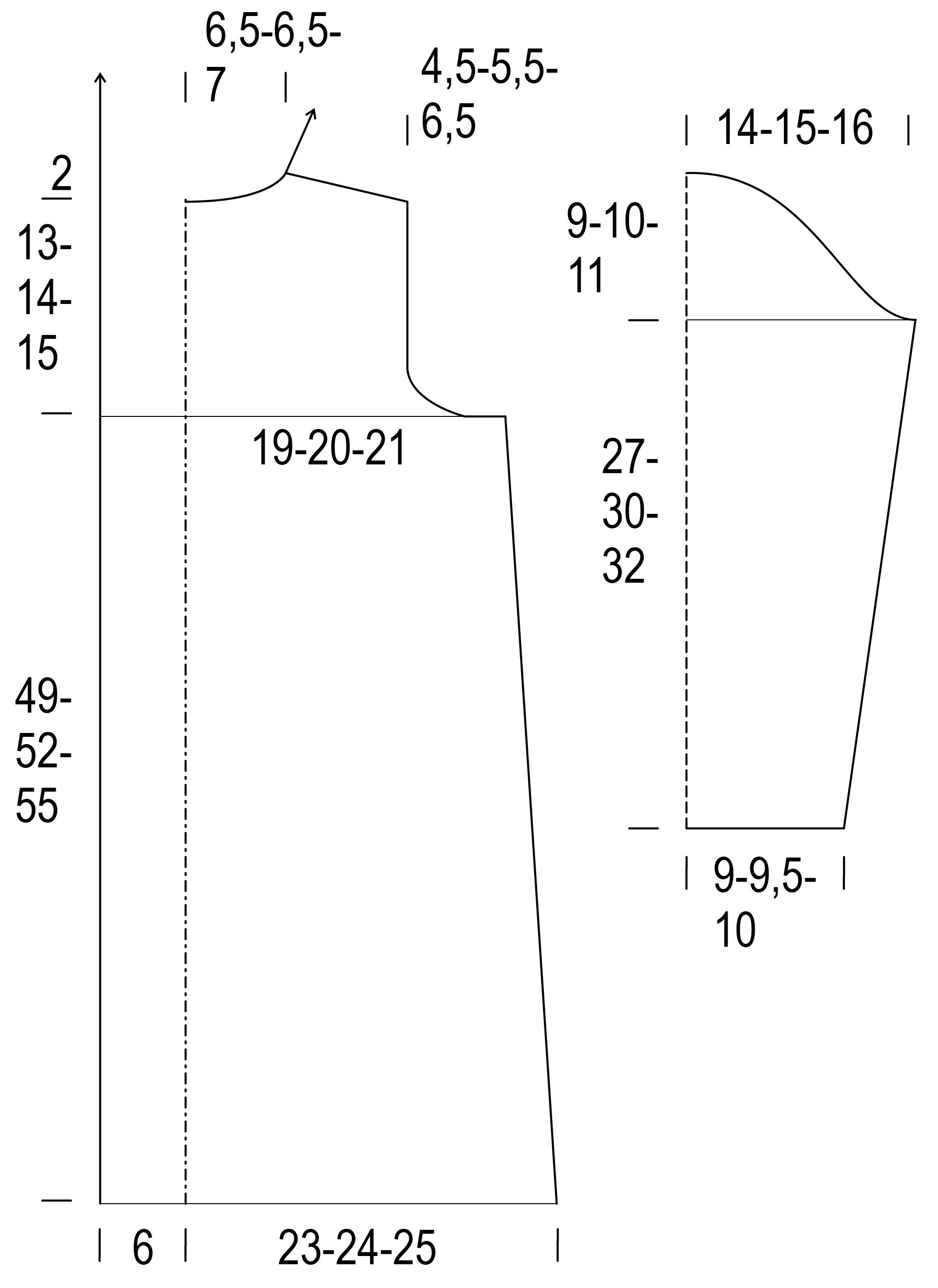 Kun kappaleen korkeus on 49(52)55 cm, päätä kädentietä varten molemmissa reunoissa joka 2. krs 1x4(4)5 s, 1x3 s, 1(2)2x2 s ja 3(3)4x1 s = 75(75)79 s.