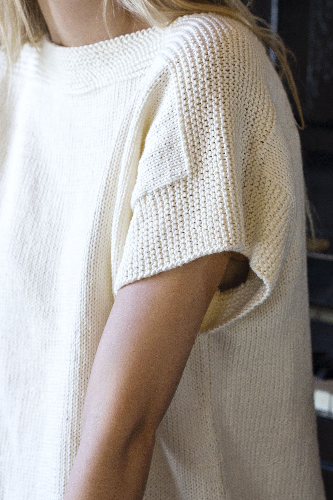 Puuvillatoppi neulotaan yhtenä kappaleena etukappaleen helmasta olalle ja sieltä edelleen takakappaleen helmaan Novita Cotton Soft -langasta. Sileässä neuleessa on kädenteillä, helmassa ja pääntiellä ainaoikeaa.