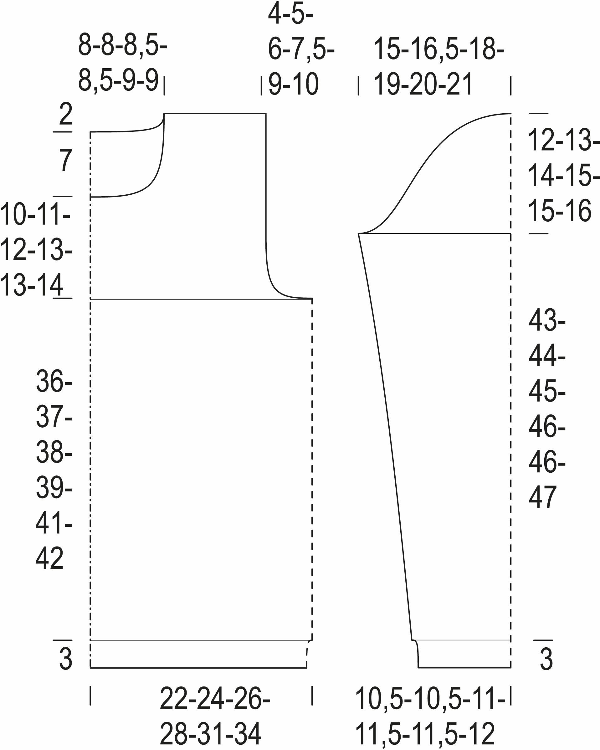 Kun kappaleen korkeus on 7(8)10(9)12(10) cm, lisää molemmissa reunoissa 1 s. Toista lisäykset 3,5(2,5)2(2)1,5(1,5) cm:n välein vielä 10(14)17(19)22(23) kertaa = 82(90)98(104)110(114) s.