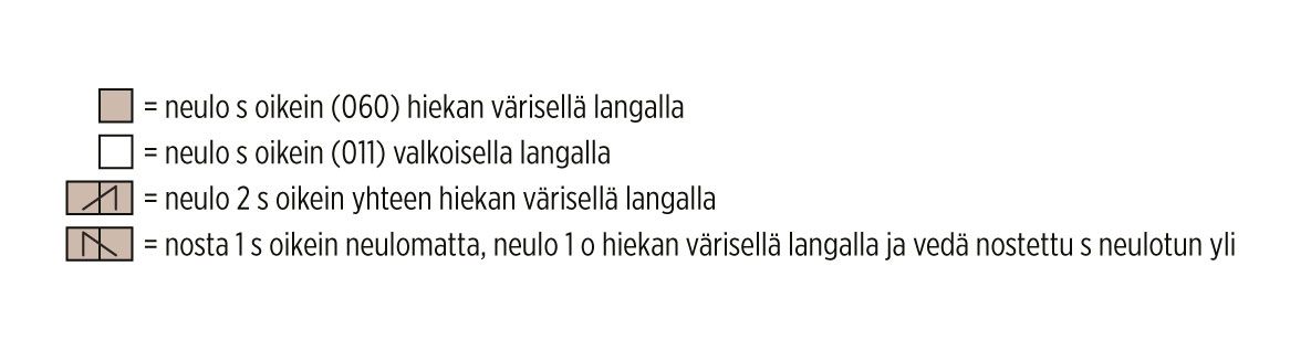 Aloita kirjoneule ruutupiirroksen 1. kerrokselta ja toista 4 s:n mallikerta 62(62)67(72)77 kertaa. Neulo sitten ruutupiirroksen kerrokset 2-5.
