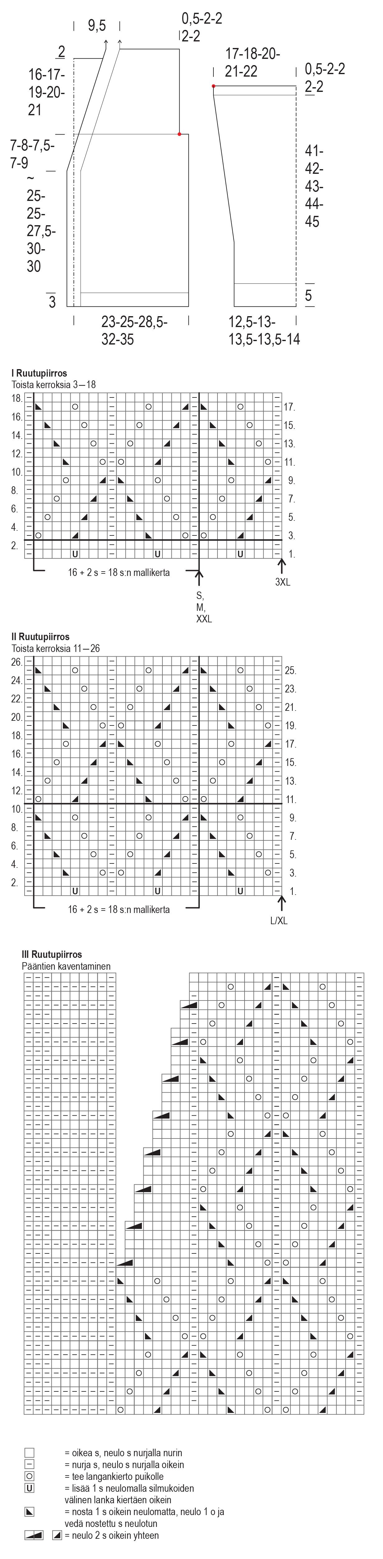 Mallineuleet Joustinneule: neulo *3 o, 1 n*, toista *-*. Sileä oikea neule: neulo s:t oikealla oikein ja nurjalla nurin. Pitsineule: neulo ruutupiirroksen ja ohjeen mukaan. Sileä nurja neule: neulo s:t oikealla nurin ja nurjalla oikein. Ainaoikeinneule: neulo s:t oikealla oikein ja nurjalla oikein.
