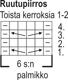 - krs (nurja puoli):*neulo s:t nurin silmukkamerkille, sm, neulo raglanin palmikko ruutupiirroksen 2. kerroksen mukaan ja sm* toista *–* vielä 3 kertaa. Neulo s:t nurin kerroksen loppuun. Toista raglanin palmikoissa ruutupiirroksen kerroksia 1–2.