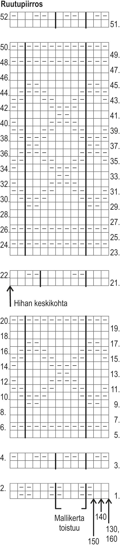 Vaihda työhön paksummat puikot ja aloita kohoneule ruutupiirroksen 21. kerrokselta. Alareunaan on nuolella merkitty kappaleen keskikohta, laske siitä kuvion aloituskohta. Toista ruutupiirroksen kerroksia 21-22.