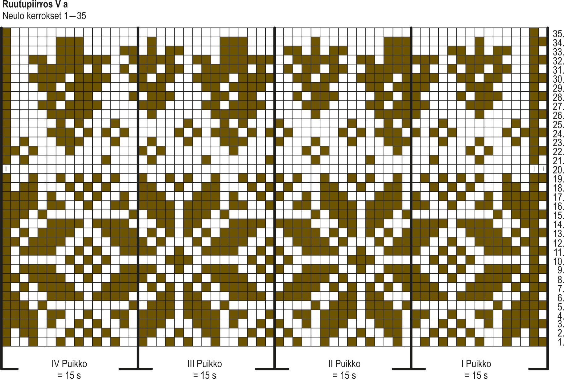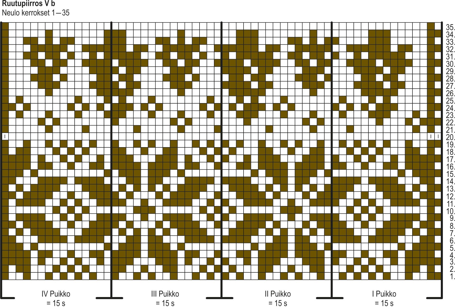 Jatka kirjoneuletta V ruutupiirroksen 1. krs:lta (käytä A-piirrosta ensimmäiseen ja B-piirrosta toiseen sukkaan). Jaa s:t puikoille ruutupiirroksen mukaan (15 s kullakin puikolla).