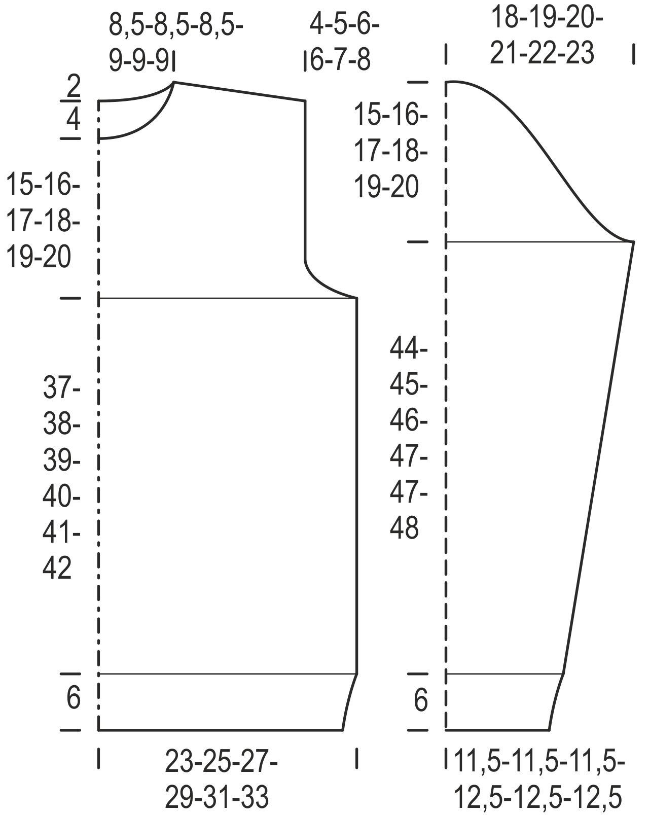 Kun kappaleen korkeus on 43(44)45(46)47(48) cm, päätä kädentietä varten molemmissa reunoissa joka 2. krs 1x3(3)4(4)5(5) s, 1(1)1(1)2(2)x2 s ja vielä 1(2)3(3)2(3)x1 s = 60(62)66(70)74(76) s.