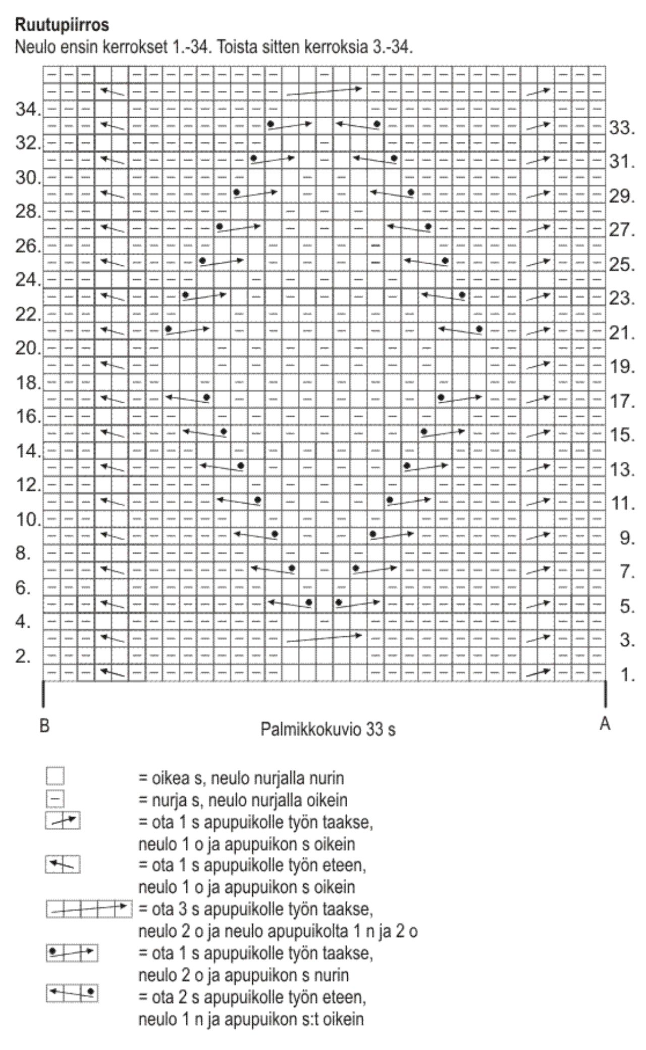 23 s ja 27 krs palmikkoneuletta = 10 cm. Kuvion leveys (= 33 s ) on n. 14 cm.