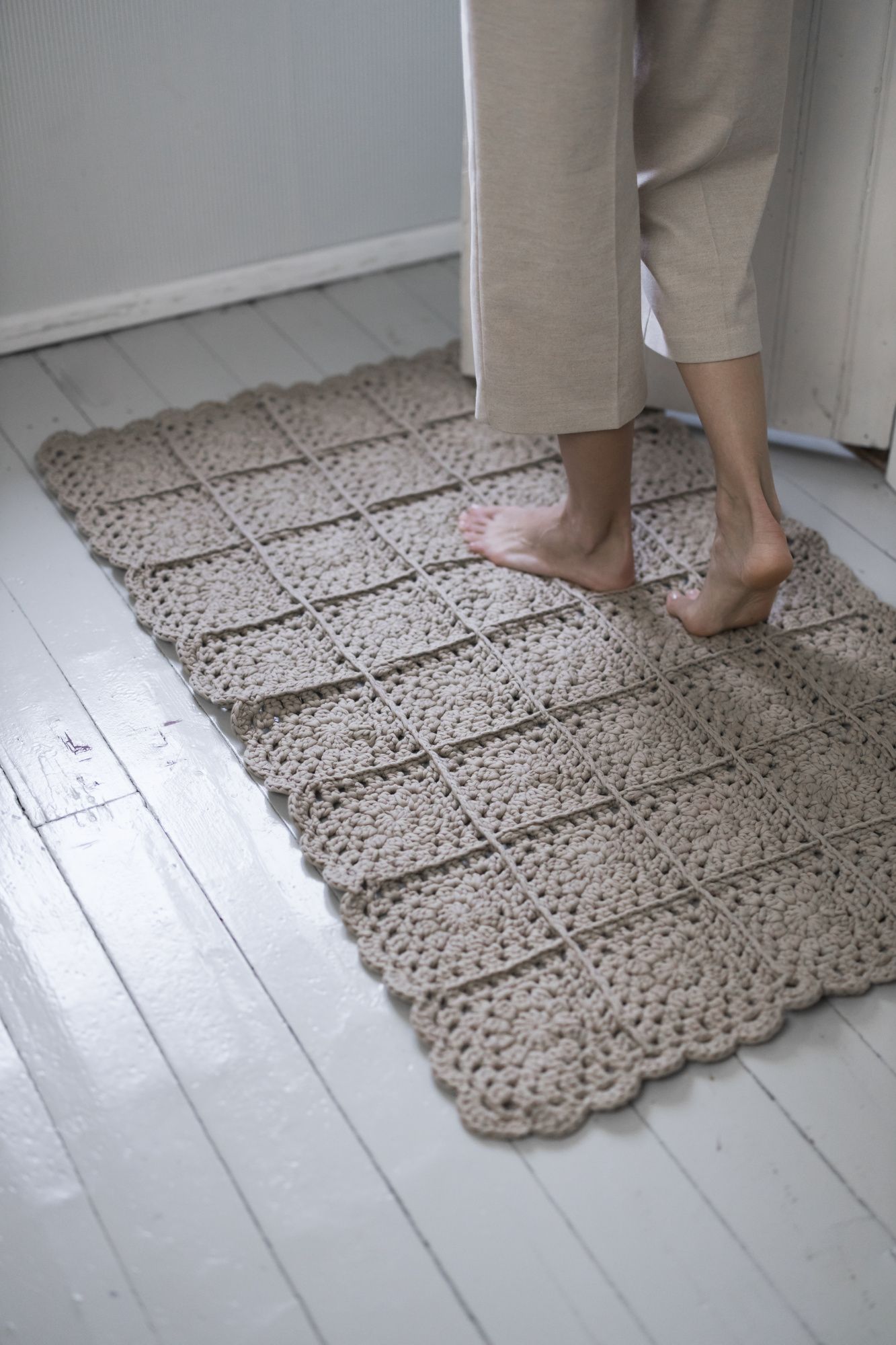 Matto virkataan 15 x 15 cm-kokoisista paloista Novita Strömsö -langasta. Palan määriä muuttelemalla matto muuntuu hyvin vaikkapa kylppäriin tai kapeaan keittiöön sopivaksi.