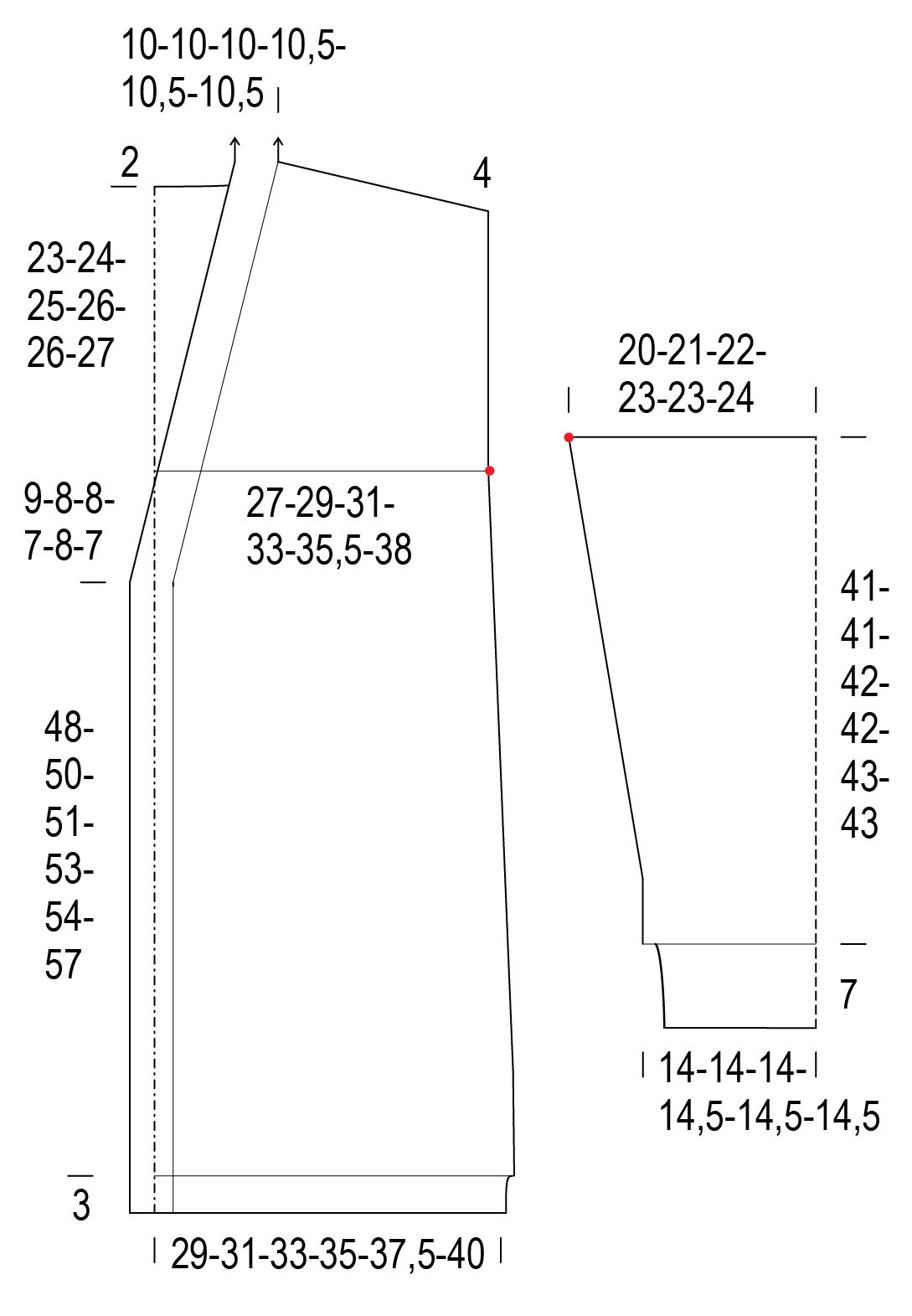 Kiinnitä hihat kädenteille merkkilankojen väliin, kaavan punaisten merkkien mukaan. Ompele hihojen saumat ja sivusaumat.