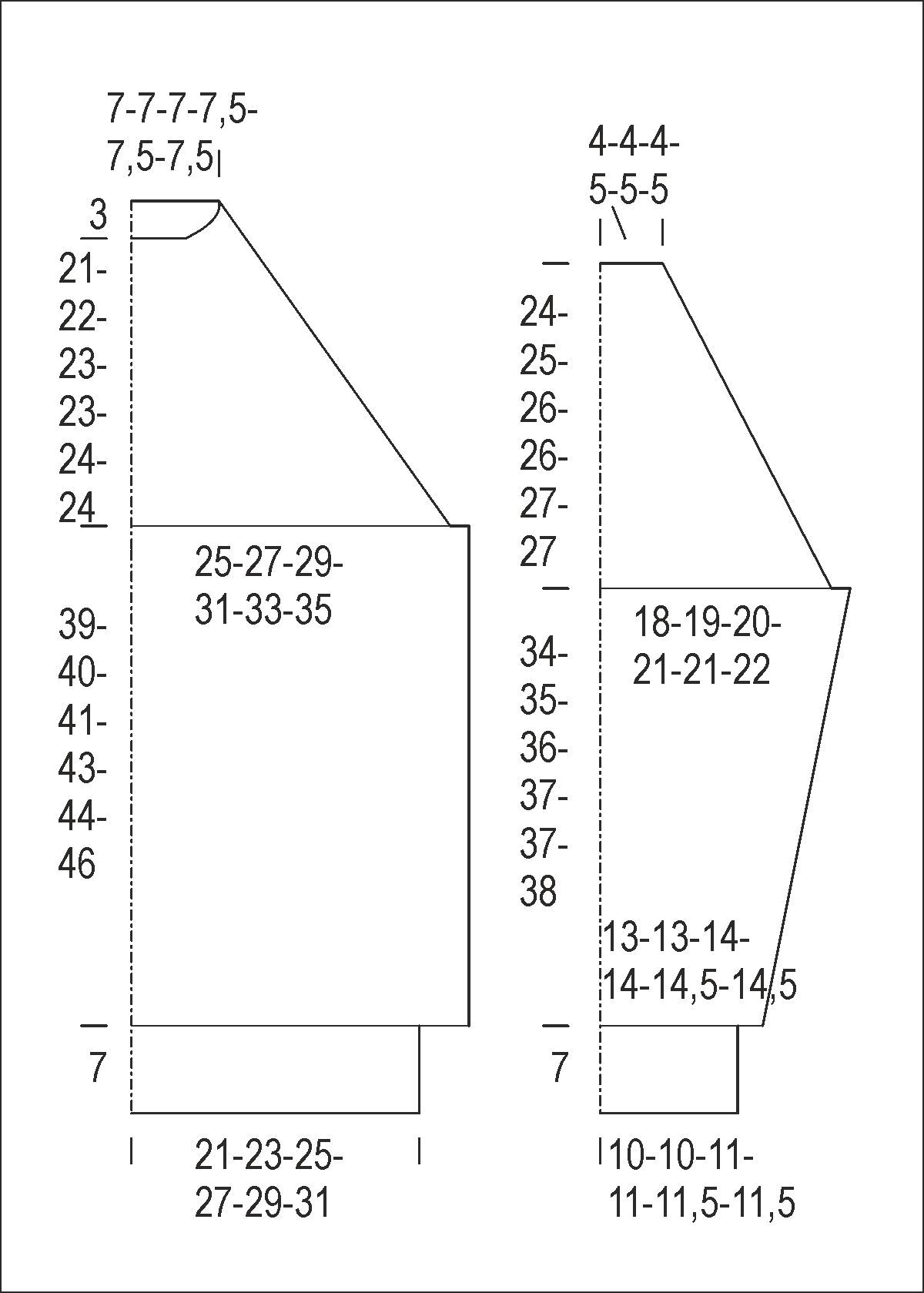 Huom. Kun kappaleen korkeus on 11(10)11(12)12(13) cm, lisää molemmissa reunoissa 1 s. Toista lisäykset 5(4)4(3,5)4(3,5) cm:n välein vielä 5(7)7(8)7(8) kertaa = 47(51)53(55)55(57) s.
