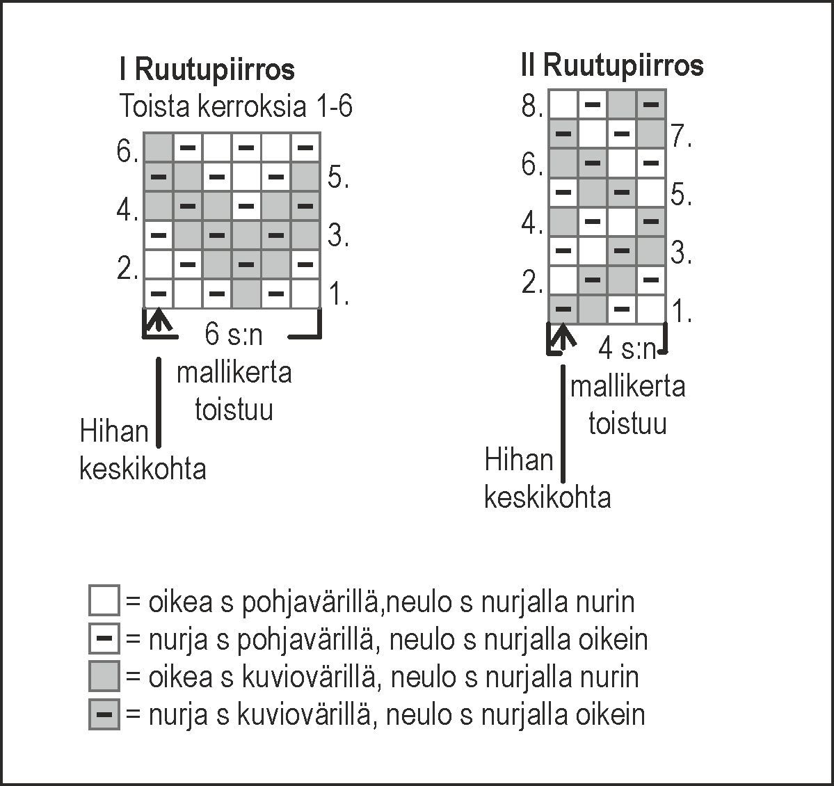 1. krs: neulo *1 o, 1 n*, toista *-*. 2. krs: neulo oikeat s:t nurin ja nurjat s:t oikein. Toista kerroksia 1-2.