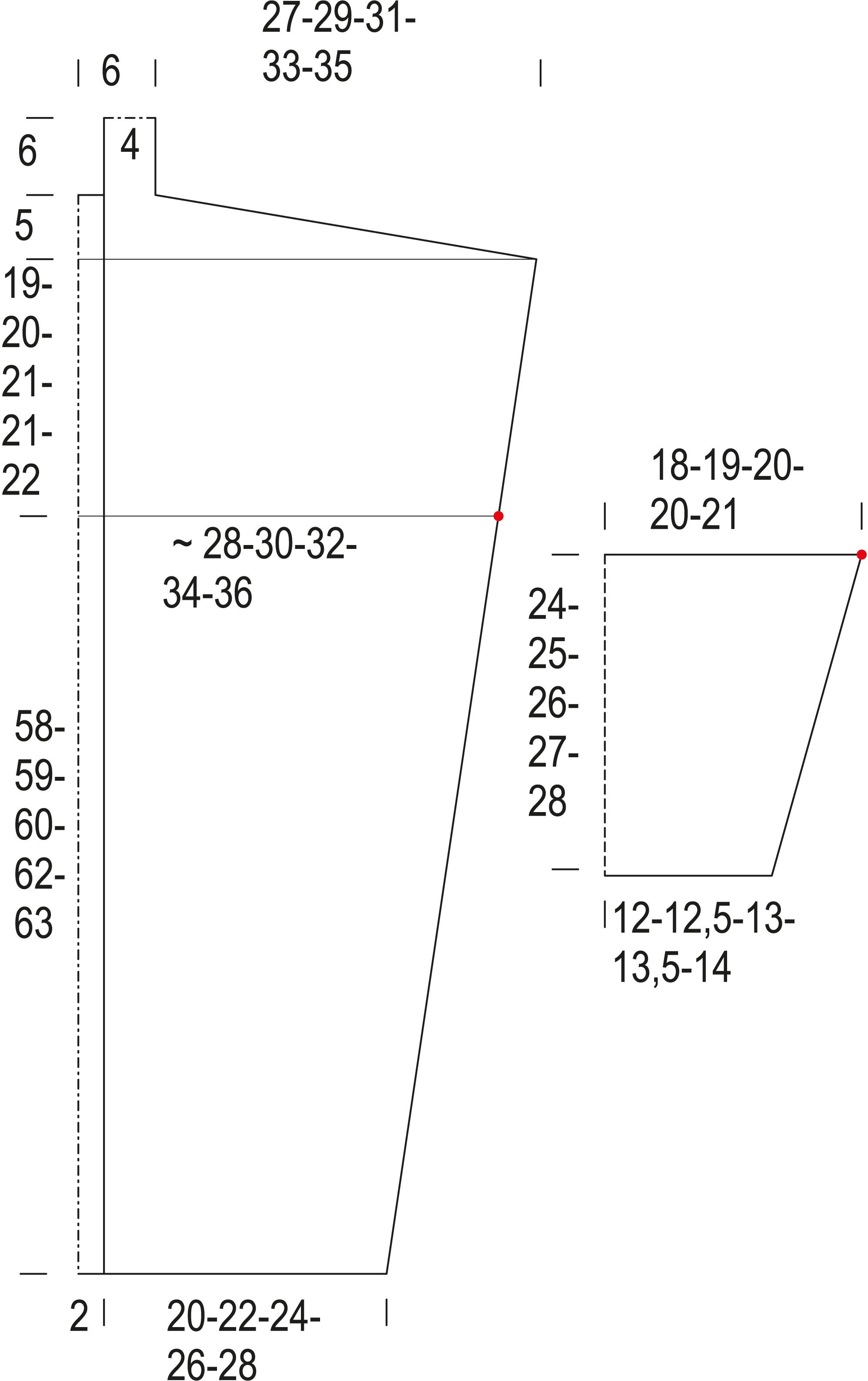 Kun kappaleen korkeus on 24(25)26(27)28 cm, päätä s:t.