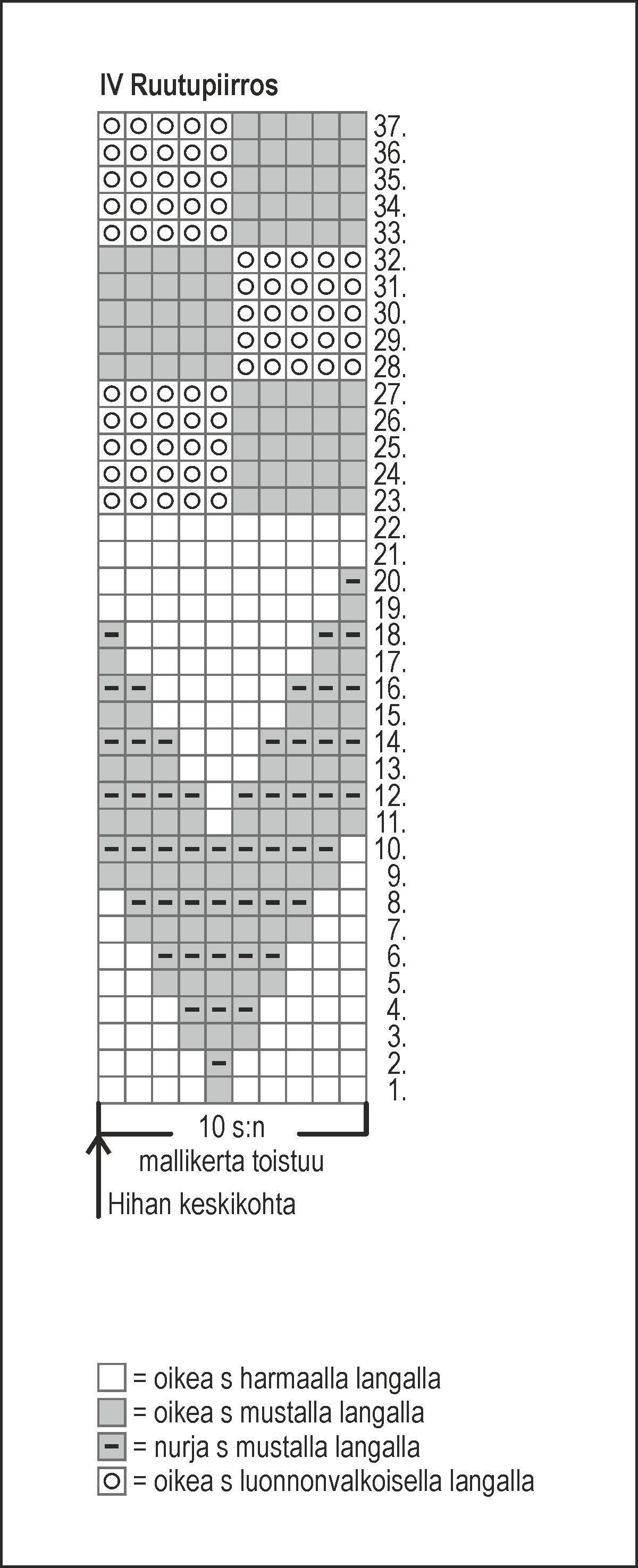 Aloita kirjoneule suljettuna neuleena IV ruutupiirroksen 1. krs:lta. Ruutupiirroksen alareunaan on nuolella merkitty kappaleen keskikohta, laske siitä kuvion aloituskohta. Neulo ruutupiirroksen kerrokset 1-37.